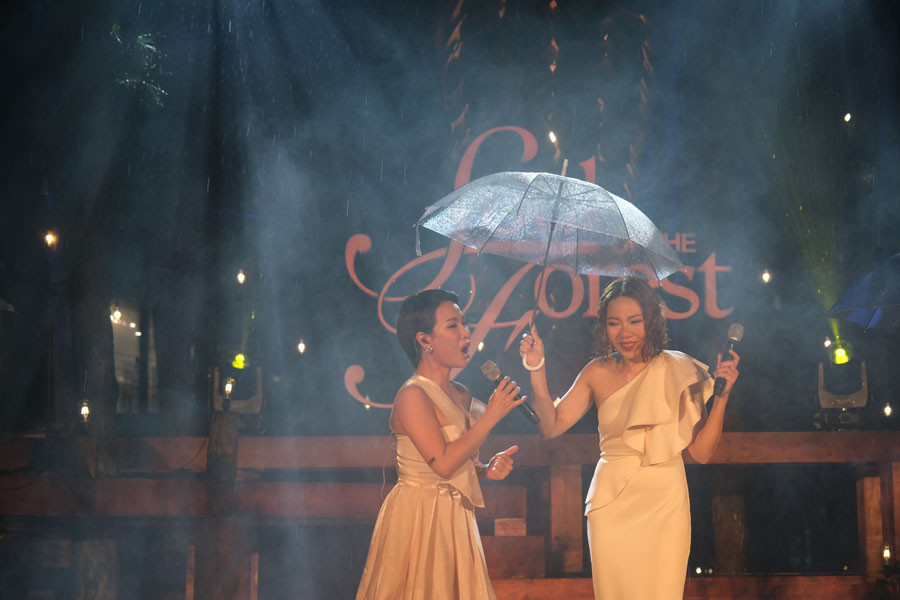 Đêm nhạc đầu tiên của chuỗi âm nhạc 'Soul of the forest', thời tiết không thuận lợi nhưng đã đem lại cảm xúc đầy thi vị khi giữa rừng thông Uyên Linh - Hà Trần và khách mời đều xích lại gần nhau, che ô và cùng cảm nhận thanh âm ngọt ngào.