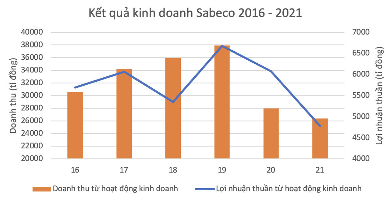 Doanh thu từ hoạt động kinh doanh của Sabeco tăng đều trong giai đoạn 2016-2019, từ mức 30.569 tỷ đồng lên đến 37.899 tỷ đồng. Lợi nhuận thuần cũng tăng trong giai đoạn trên, từ 5.692 tỷ lên đến 6.675 tỷ trước khi giảm trong giai đoạn 2020-2021.