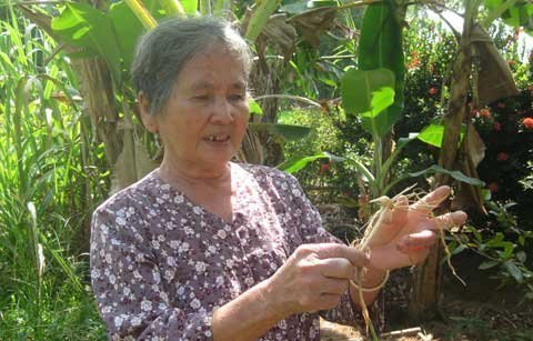 | Bà Sáu Chanh nhổ cây cỏ ống, loài cây này có thể sơ cứu khi bị rắn cắn. Ảnh: Quốc Huy |