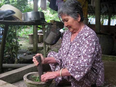 | Bà Sáu Chanh rửa sạch các lá thuốc, đem giã cho người bệnh uống. Ảnh: Quốc Huy |