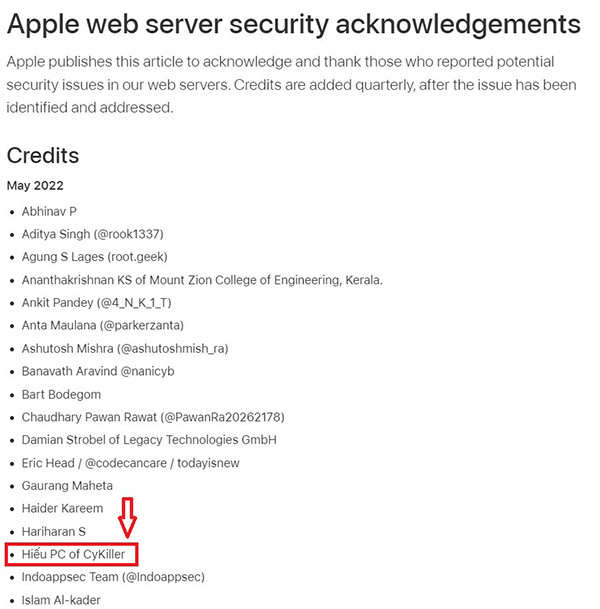 Trang chủ Apple vừa công bố danh sách các chuyên gia bảo mật đã có đóng góp cho hãng này trong tháng 5/2022. Đây là danh sách được thiết lập nhằm ghi nhận và cảm ơn đóng góp của các chuyên gia bảo mật, những người đã tìm ra và báo cáo lại về những lỗi tiềm ẩn trong máy chủ web của Apple.