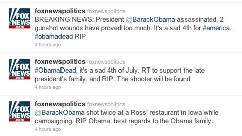 Trên thực tế, hacker đã truy cập được vào tài khoản có 33.000 người đăng ký theo dõi (follower) này từ sáng sớm và đoạt luôn quyền sử dụng tài khoản. Thông điệp về ông Obama được đăng trên tài khoản Fox News Politics từ 2h30 phút chiều 4/7 (giờ Việt nam) và cho đến thời điểm 20h tối, nó vẫn chưa bị xóa bỏ. "Tổng thống đã không qua khỏi sau khi bị trúng hai phát đạn. Hiện chưa rõ danh tính kẻ bắn".