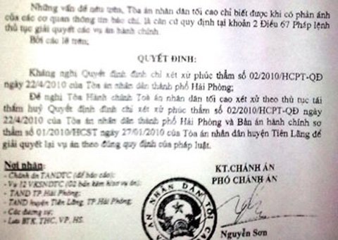 Những vấn đề nêu trên (sai phạm của hai cấp tòa - NV), TAND Tối cao chỉ được biết khi có phản ánh của các cơ quan thông tin báo chí, là căn cứ quy đinh tại khoản 2 Điều 67 Pháp lệnh Thủ tục giải quyết các vụ án hành chính để TAND Tối cao kháng nghị theo thủ tục tái thẩm. Kháng nghị tái thẩm nêu.