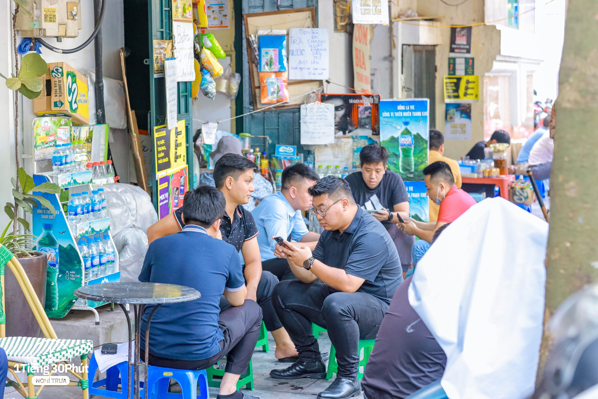 Sau khi dùng bữa xong, từng nhóm từng nhóm dân văn phòng lại tìm đến những quán trà đá. Một trong những nét đặc trưng rất Hà Nội. Anh Hải chia sẻ: "Dùng bữa xong, mình và đồng nghiệp thường đi trà đá tiếp một phần cho tỉnh toán, trò chuyện cũng thoải mái hơn chứ lên văn phòng mát thì mát thật nhưng đâu thể nói chuyện này chuyện kia được". Thậm chí chúng tôi cũng bắt gặp những nhóm dân văn phòng dùng bữa trên công ty nhưng vẫn quyết vượt nắng để xuống ngồi trà đá tám chuyện với nhau.