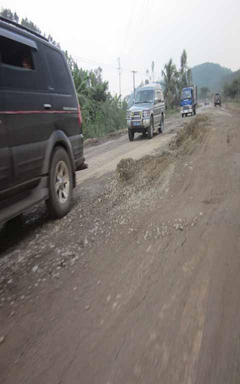 | Có đoạn hàng chục mét bị bong toác phần như, mỗi lúc xe cộ chạy qua là lại bụi mù mịt |