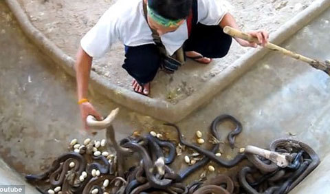 trăm con rắn bao quanh người đàn ông, nhưng anh ta vẫn bình thản quét dọn mà