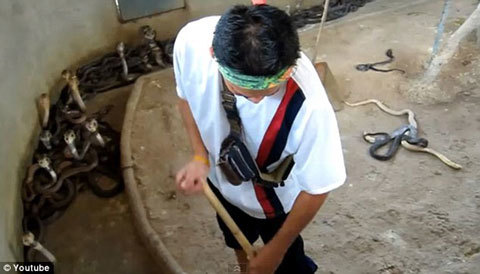 bình thản cầm chổi tre đi vào chuồng rắn. Dưới hầm bê tông, những con rắn hổ