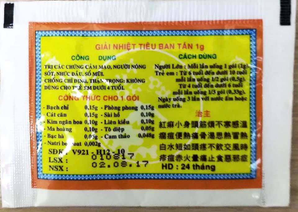 Chị N.T.T ở Quận Hoàng Mai, Hà Nội có cô con gái năm nay 7 tuổi, cháu thường xuyên bị các bệnh về mũi họng và cảm mạo liên tục, mặc dù chi T đã cho con chạy chữa nhiều nơi, đi khắp các bệnh viện nhưng tình trạng không cải thiện. Vì thế cháu 7 tuổi nhưng người nhỏ bé, ốm nheo ốm nhóc. Mới đây, nghe có người mách loại thuốc Đông y gia truyền đặc trị bệnh của cháu, chị T liền nhờ người bạn mua cho con uống. kết quả thật bất ngờ chỉ sau khi dùng khoảng hơn 1 tháng cháu gần như khỏi hẳn tình trạng bệnh lại còn ăn tốt, ngủ tốt, tăng cân rất nhanh. Điều này làm vợ chồng chị T rất mừng. Thuốc này là dạng bột, có tên là “giải nhiệt tiêu ban tán”. Loại thuốc này chỉ ghi ở bao bì một dòng chữ là cơ sở Phú Sơn địa chỉ ở 165 Lê Đại Hành, Quận 11, Tp. Hồ Chí Minh ngoài ra không ghi thêm bất kỳ thông tin gì đến giấy phép sản xuất hay số điện thoại liên lạc.