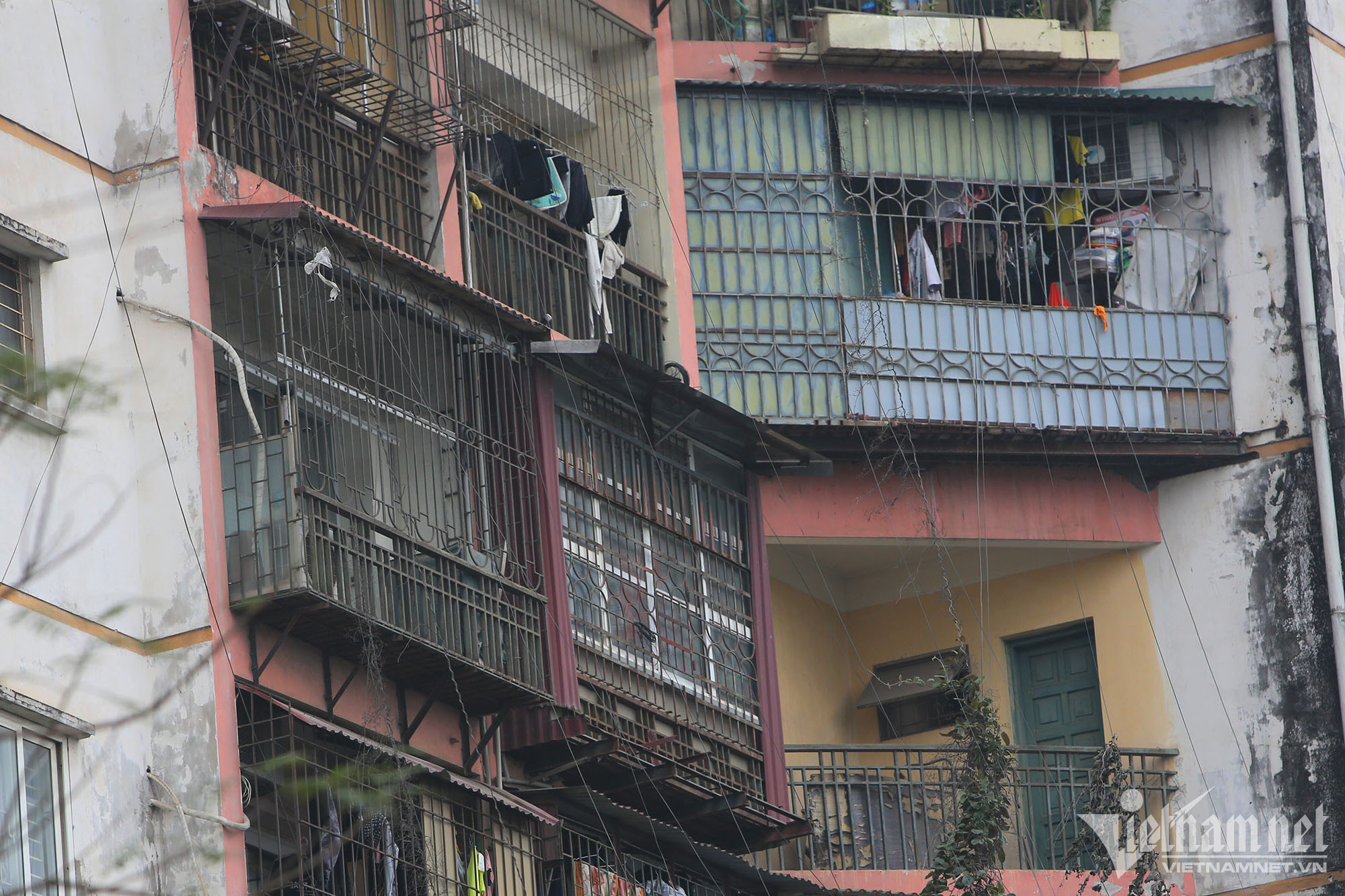 Tại chung cư cũ A12 phố Tôn Thất Tùng (Đống Đa), các “chuồng cọp” tầng tầng lớp lớp xếp chồng lên nhau. Có hộ gia đình chỉ làm lồng sắt, sàn gỗ để đua ra bên ngoài tăng diện tích nhưng có hộ lại thưng bên ngoài hàng rào sắt, bên trong xây kín.