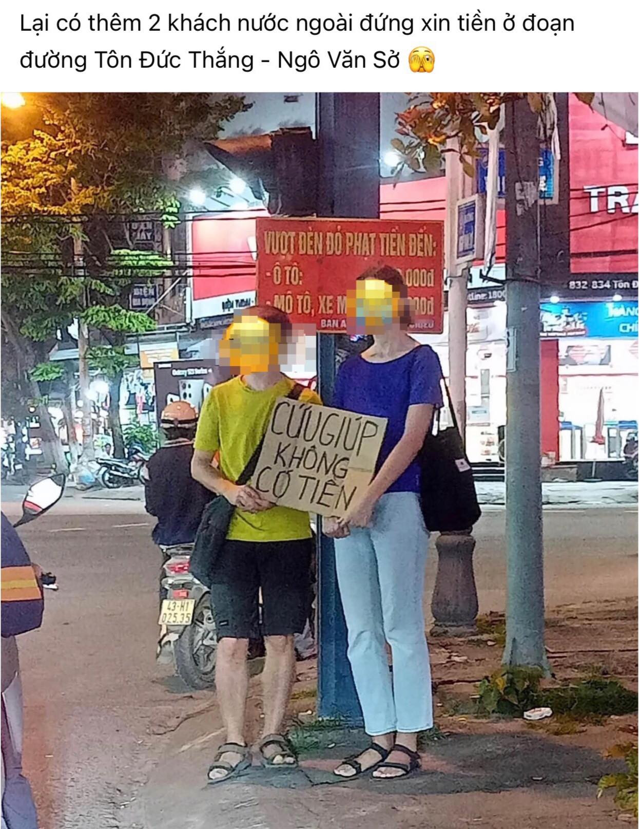Tối 7/3, trên mạng xã hội đăng tải hình ảnh hai người nước ngoài (một nam, một nữ) đứng tại góc ngã tư đường Tôn Đức Thắng- Ngô Văn Sở (quận Liên Chiểu, Đà Nẵng), trên tay cầm tấm biển với nội dung “Cứu giúp không có tiền”.