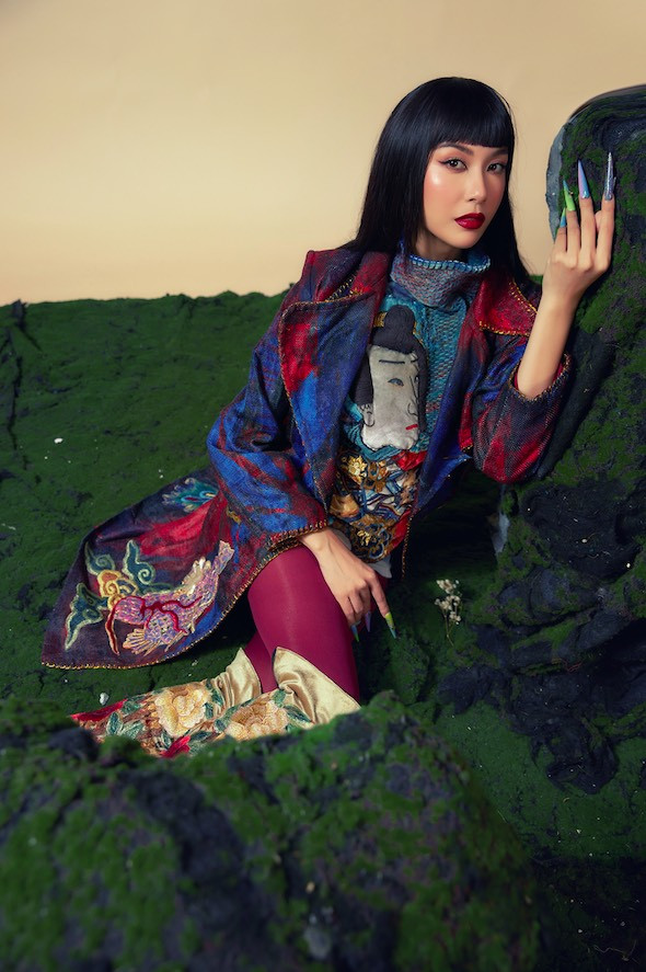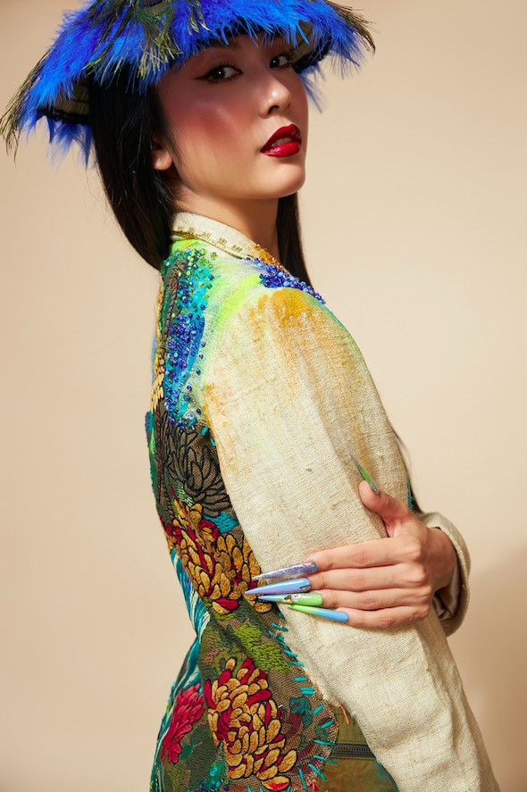 Bộ sưu tập Hồi sinh gồm 15 thiết kế kết hợp hài hòa giữa truyền thống và hiện đại. Trong bộ ảnh, Á hậu - ca sĩ Thuý Vân tạo dáng phóng khoáng, thoải mái cùng thần thái thu hút.Một số thiết kế được làm bằng vải lanh dệt tay và xử lý thủ công. Hoạ tiết hoa sen, rồng phụng, kiến trúc cổ,… được Huỳnh Hải Long và Đặng Thế Huy khéo léo đưa vào, biến trang phục thành những bức tranh cổ truyền.Điểm đặc biệt, chất liệu toàn bộ thiết kế được làm từ trang phục cũ tái sử dụng - lý do bộ sưu tập mang tên "Hồi sinh". Hai nhà thiết kế tìm những bộ trang phục đã qua sử dụng để cân chỉnh, cắt ghép, tạo thành những thiết kế mới giàu sáng tạo. “Bảo vệ môi trường là vấn đề được cả thế giới quan tâm. Trên nền vải thân thiện với môi trường, chúng tôi đưa thế mạnh của mình là hoạ tiết thêu truyền thống, tạo nên những tác phẩm nghệ thuật", NTK Huỳnh Hải Long nói.NTK Đặng Thế Huy cho hay, hai người muốn mong muốn đem nét văn hoá, truyền thống Việt đến sự kiện thời trang lớn nhất thế giới. Hai nhà thiết kế đã dày công tìm hiểu cách thể hiện hoạ tiết trên trang phục và kỹ thuật thêu tỉ mỉ đến từng chi tiết nhỏ, saho cho mang đậm hồn Việt nhất.Á hậu, ca sĩ Thuý Vân - người mẫu thể hiện bộ sưu tập "Hồi sinh" - bày tỏ sự đồng điệu đối với thông điệp của NTK Hải Long và Thế Huy. Cô ấn tượng với các bộ trang phục ngay từ cái nhìn đầu tiên bởi sự công phu và tỉ mỉ.