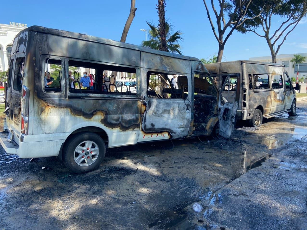 Tại hiện trường, hai ô tô 16 chỗ bị lửa thiêu rụi trơ khung sắt, một ô tô 5 chỗ đỗ gần đó bị cháy sém.