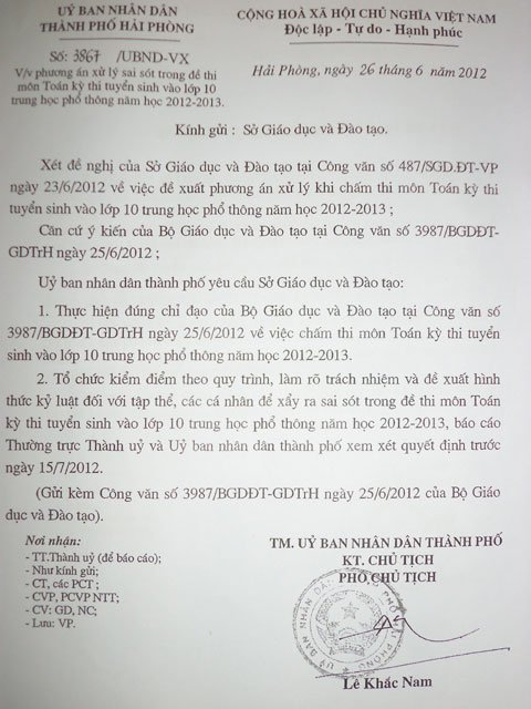 Công văn do phó Chủ tịch UBND TP Hải Phòng Lê Khắc Nam yêu cầu Sở GD-ĐT Hải Phòng kiểm điểm làm rõ trách nhiệm, báo cáo trước 15/7. |