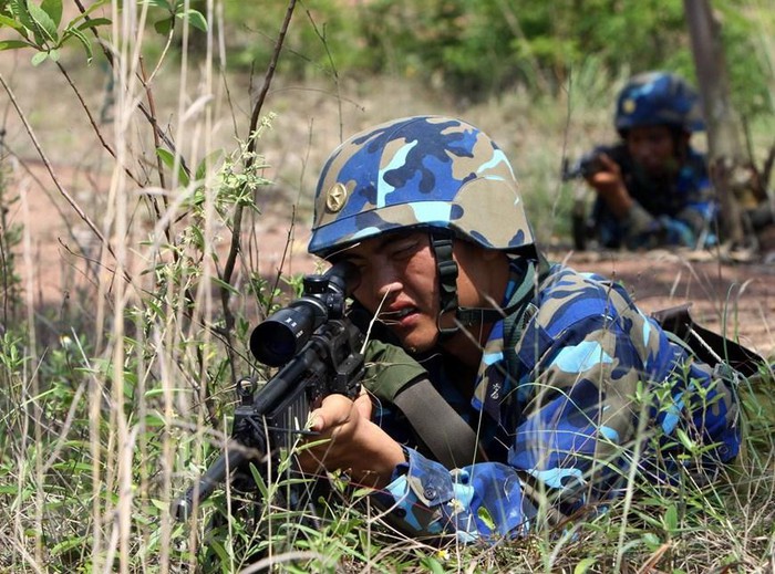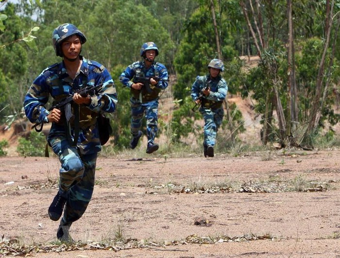 Chiến sỹ Lữ đoàn Hải quân đánh bộ 147 luyện tập phục kích, đánh chiếm mục tiêu. (Ảnh: Trọng Đức/TTXVN)