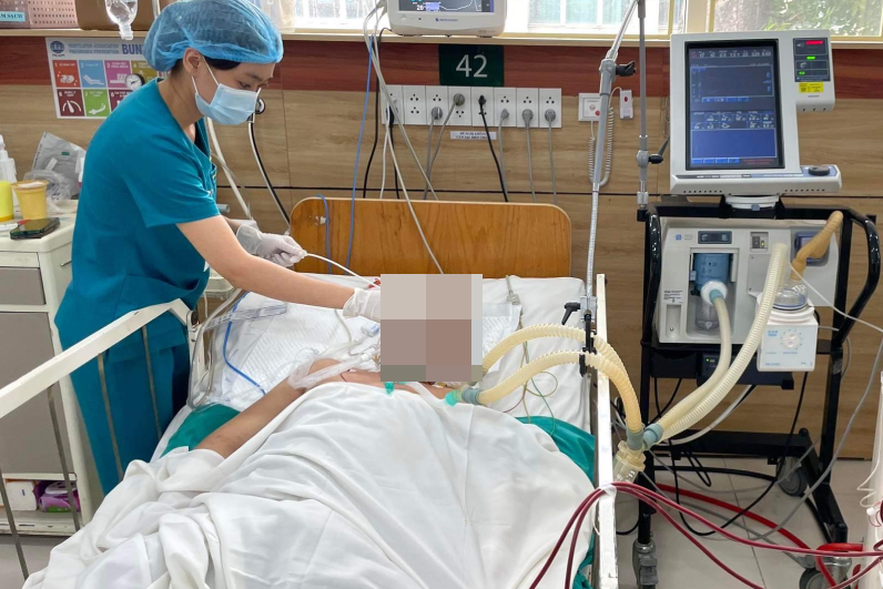 Sau 4 ngày điều trị, bệnh nhân H. đã qua cơn nguy kịch nhưng vẫn hôn mê, phải thở máy, tình trạng tổn não rất nặng nề.