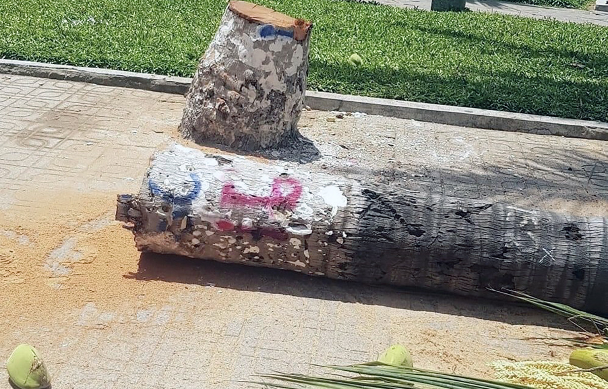 Chiều 10/6, nhiều cây dừa sau khi bị chặt còn nằm dọc đường Trần Phú, theo hướng từ tháp Trầm Hương về cầu Trần Phú. Một số cây còn nguyên gốc, chưa bị đào lên. Cạnh đó, nhiều công nhân đang thi công, chỉnh trang vỉa hè, và trồng lại những cây dừa con.