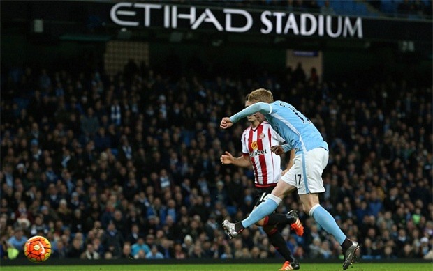 Trên sân Etihad, Mèo đen tỏ ra khá tự tin nhập cuộc trước đội chủ nhà. Tuy vậy, sự tự tin ấy cũng chỉ giúp Sunderland tạo được thế trận ngang ngửa trong ít phút đầu trận với một vài pha phản công có nét, trước khi phải chịu bàn thua đầu tiên vào phút 13. Từ đường tạt bóng bên cánh phải của De Bruyne, Sterling bật cao đánh đầu tung lưới thủ thành Mannone.