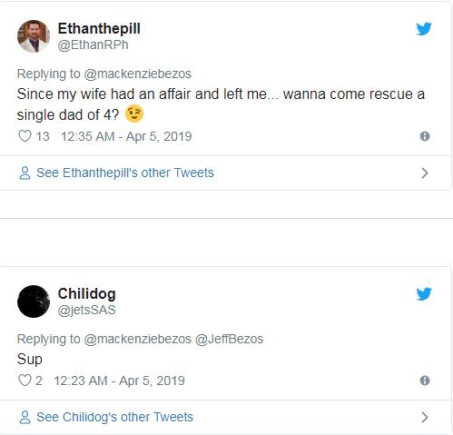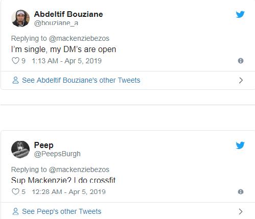 Và một điều đã xảy ra, không hiểu đó là điều bất ngờ hay thường lệ, rất nhiều đàn ông đã tỏ ra quan tâm đến bà MacKenzie Bezos độc thân. Hàng loạt người đã lên Twitter và tung những tin nhắn, thông điệp "rùng rợn", từ cầu hôn đến ghen tị, ganh đua và mời đi ăn tối, cà phê, để đua sự chú ý của bà. Tất cả các tweet này là những câu trả lời công khai cho tweet đầu tiên của MacKenzie Bezos về vụ ly hôn của bà đang hoàn tất.
