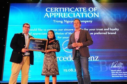 | Ban lãnh đạo MBV và đại lý Vietnam Star trao kỉ niệm chương cho đại diện công ty Trung Nguyên (giữa) |