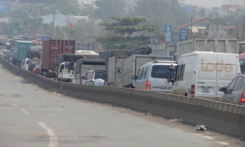 Bên ngoài quốc lộ 1A, giao thông bị phong tỏa gây cảnh kẹt xe nghiêm trọng. Hai xe chữa cháy của Phòng CSPCCC tỉnh Bình Dương chi viện cũng bị kẹt cứng trong dòng xe này…