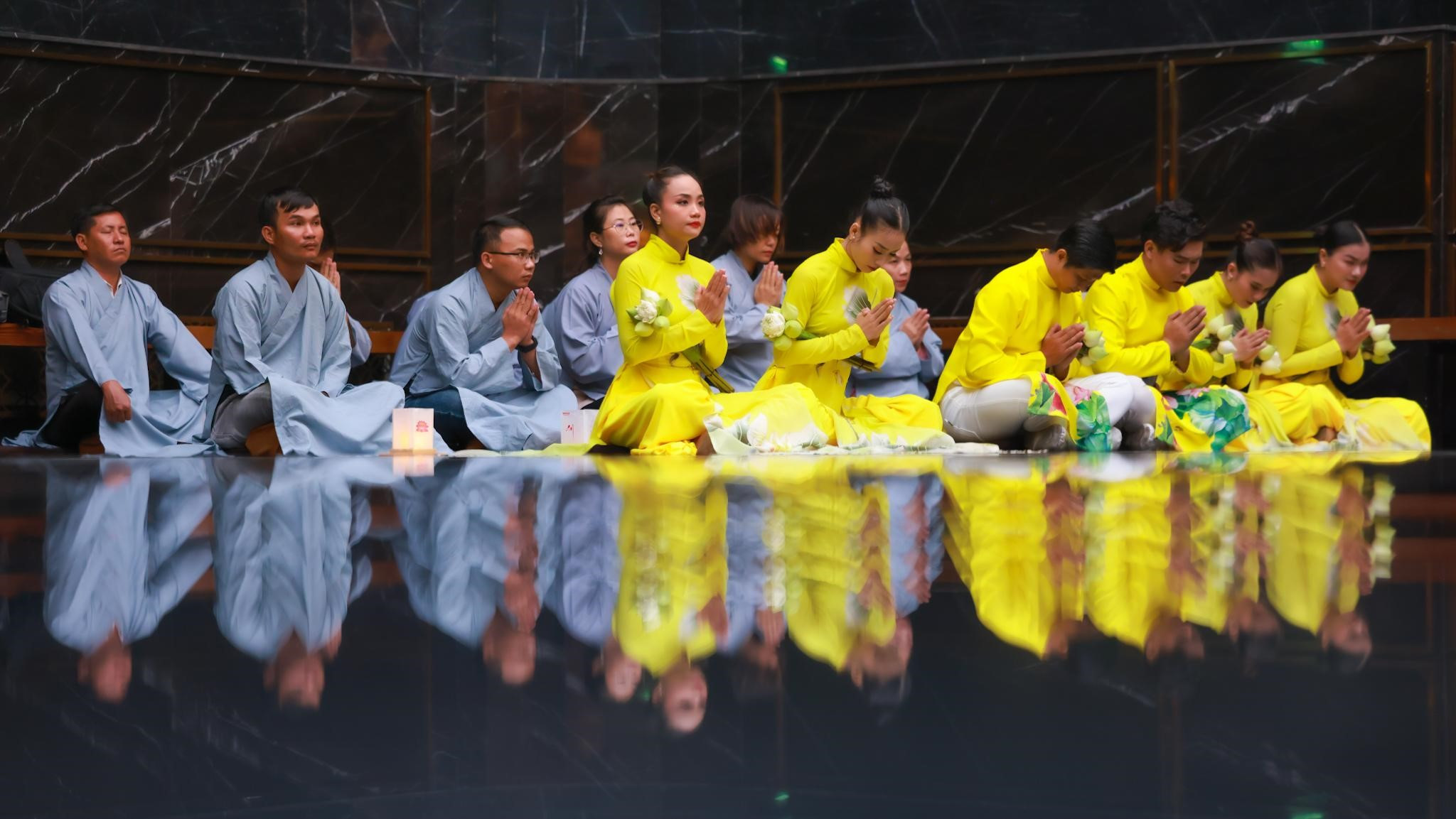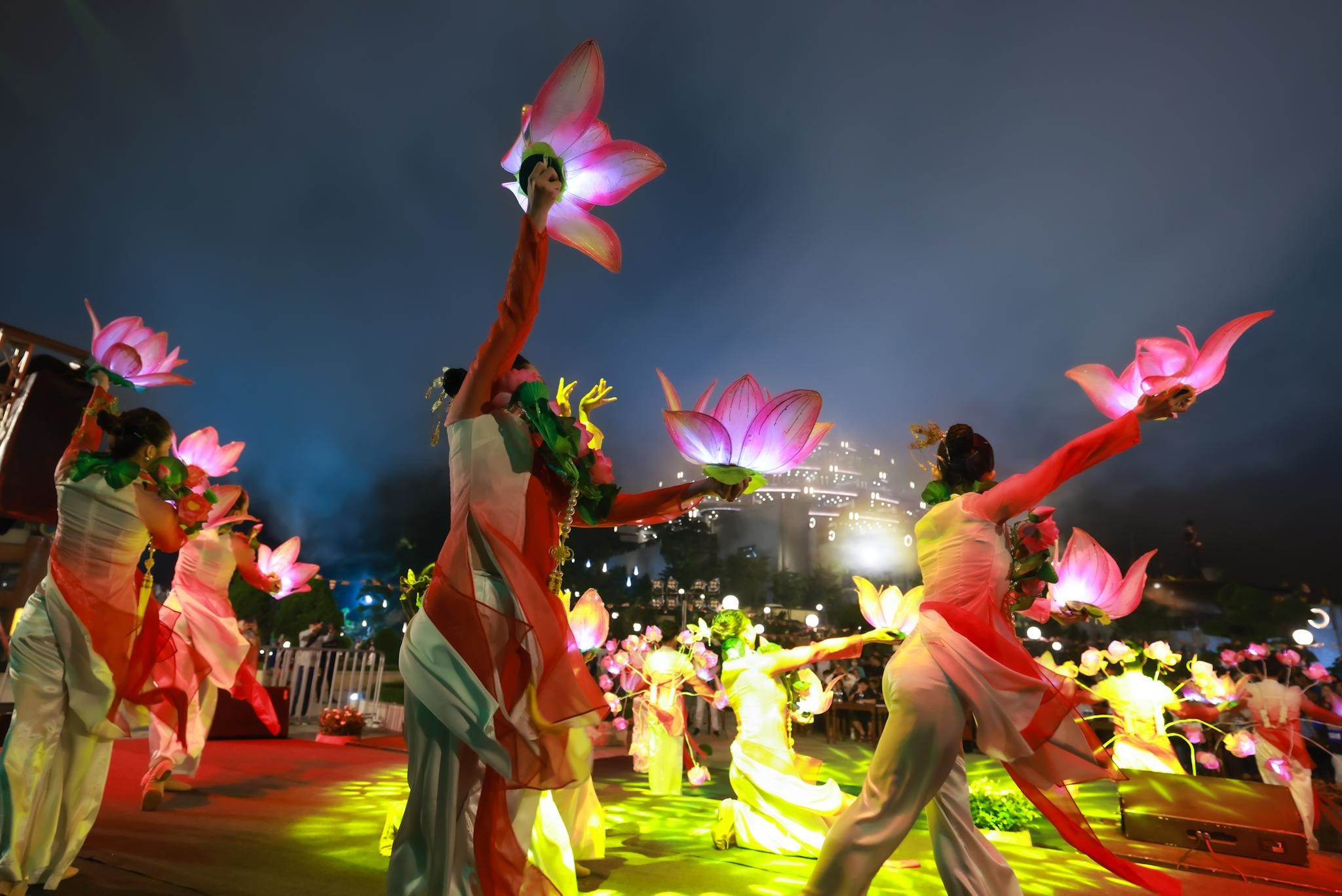 Nổi bật là tiết mục múa đèn hoa đăng của các nghệ sỹ trong trang phục hoa sen. Trong ánh sáng lung linh của sân khấu đêm 3/6, điệu múa đã khắc họa vẻ đẹp thanh tao của bông hoa sen đang bung nở, tượng trưng cho sự thuần khiết, giác ngộ và thức tỉnh tâm linh.