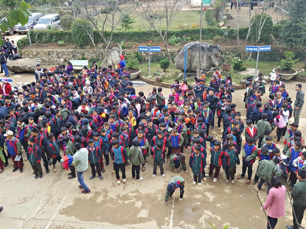 Tại đây, đoàn thiện nguyện đã thay mặt các nhà hảo tâm trao tặng 1.150 chiếc áo ấm, 1.150 đôi dép tổ ong cho học sinh trường Trường Phổ thông Dân tộc Bán trú THCS Trung Thu, trường tiểu học và mầm non xã Trung Thu; 350 bộ quần áo dài tay cho học sinh mầm non; 150 chiếc chăn ấm cho 3 nhà bán trú.