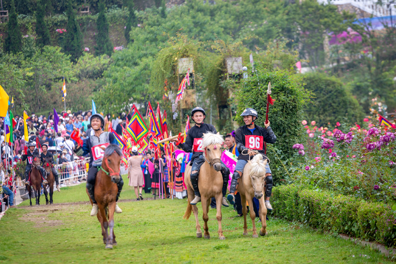 Hàng nghìn du khách sớm có mặt tại nhà ga, chọn cho mình những vị trí đẹp nhất để đón xem lễ khai mạc. Sau nghi thức châm đuốc khai hội, 16 nài ngựa cùng đoàn nghệ thuật khởi động màn diễu hành trong không gian ngợp cờ hoa. Du khách đặc biệt hào hứng, hò reo khi chứng kiến những “kỵ sĩ” trong trang phục dân tộc vùng cao biểu diễn ném lao, diễu cờ đầy khí thế.