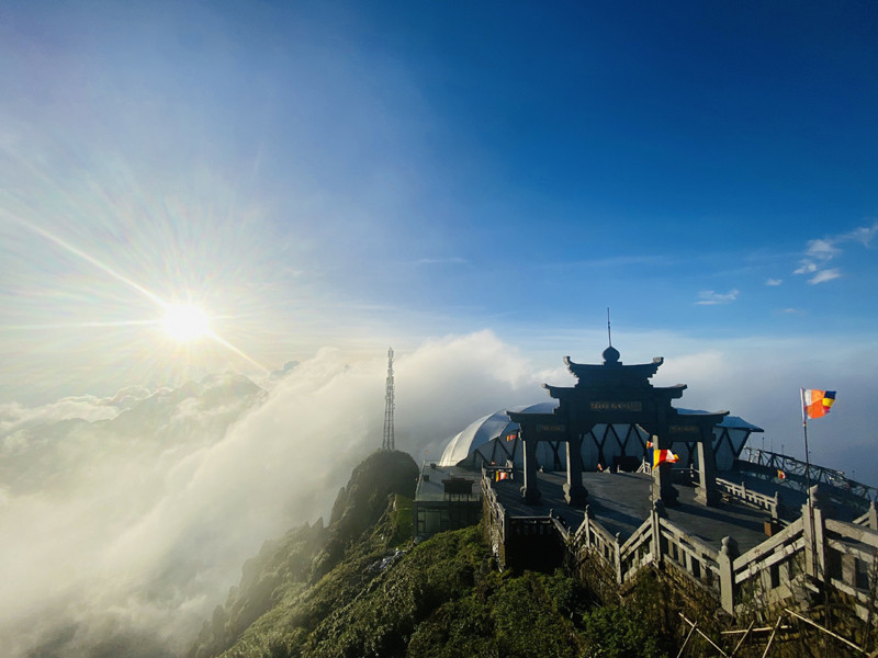 Hành trình khám phá “kinh đô nghỉ hè” Sa Pa không thể thiếu chuyến du ngoạn cùng cáp treo lên đỉnh Fansipan đẹp tựa bồng lai tiên cảnh. Không ở đâu trên dải đất hình chữ S, du khách được ngắm nhìn nền trời cao trong vắt, mặt trời chiếu rọi và biển mây cuồn cuộn chảy gần sát đến thế. Ở “Nóc nhà Đông Dương”, thời tiết như đông về giữa hạ, khi nền nhiệt không quá 20 độ C. Càng về chiều, đỉnh Fansipan càng huyền ảo với bồng bềnh mây trắng và những vệt nắng cuối ngày trải từng vệt trên biển mây, khung cảnh tựa như tranh vẽ khiến du khách không muốn rời bước.