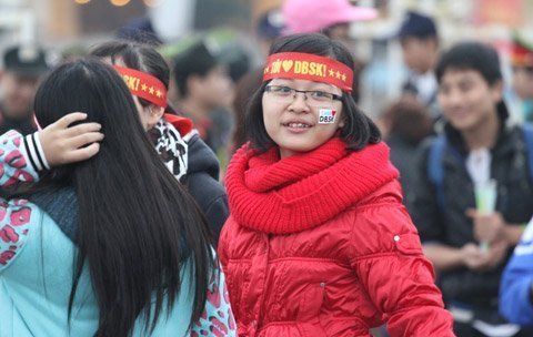 Một fan tên Lan học sinh của trường cấp 2 còn mặc nguyên áo đồng phục háo hức khoe với bạn: “Tao kiếm được vé rồi, bõ công từ đầu giờ chiều đến giờ” khiến PV Vietnamnet ngỡ ngàng. Hỏi thêm mới biết cô học sinh này đã có mặt ở đầy từ 14h chiều, bán miếng nhựa vẫy sáng cho các fan đi xem KPOP.