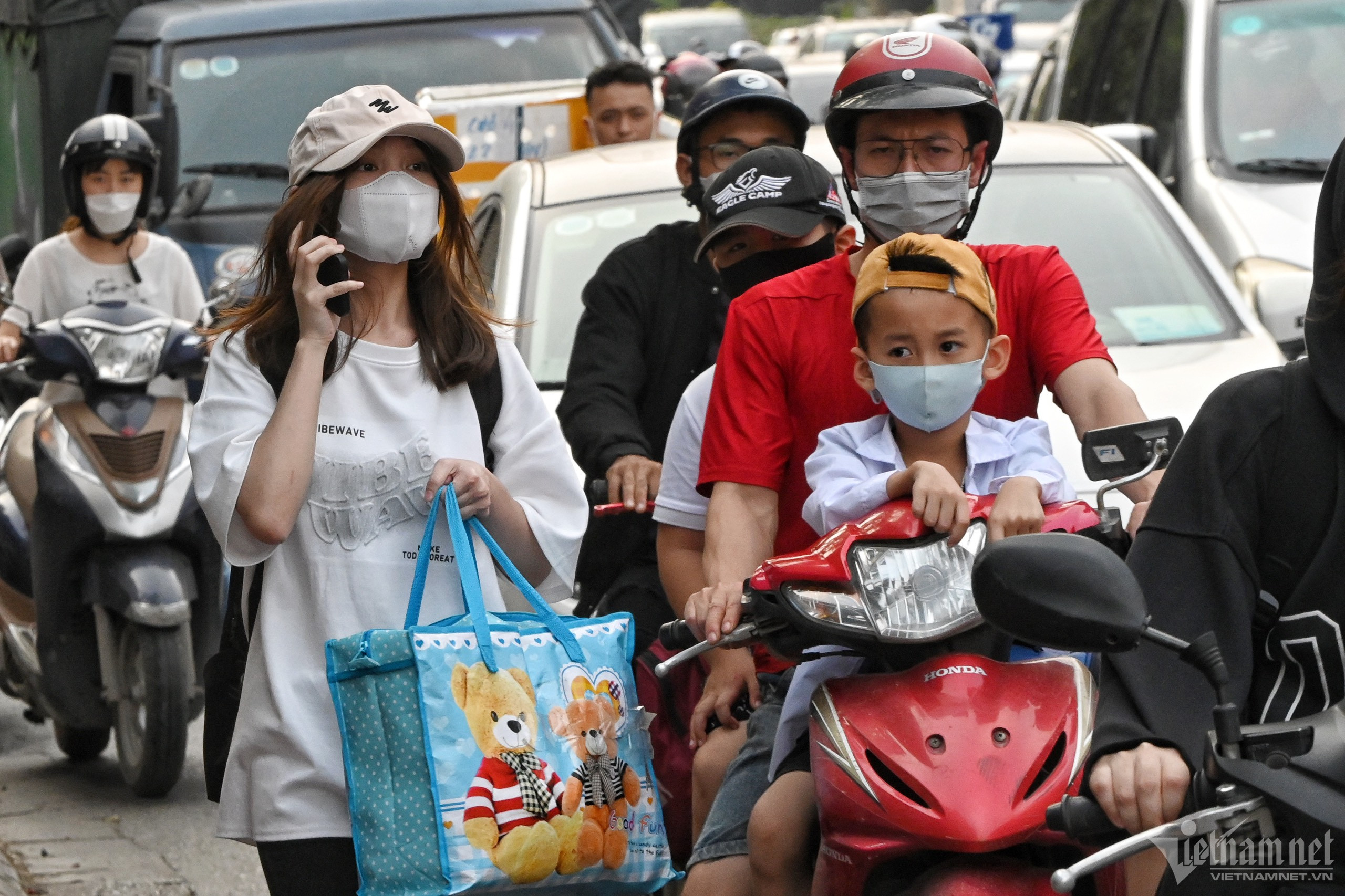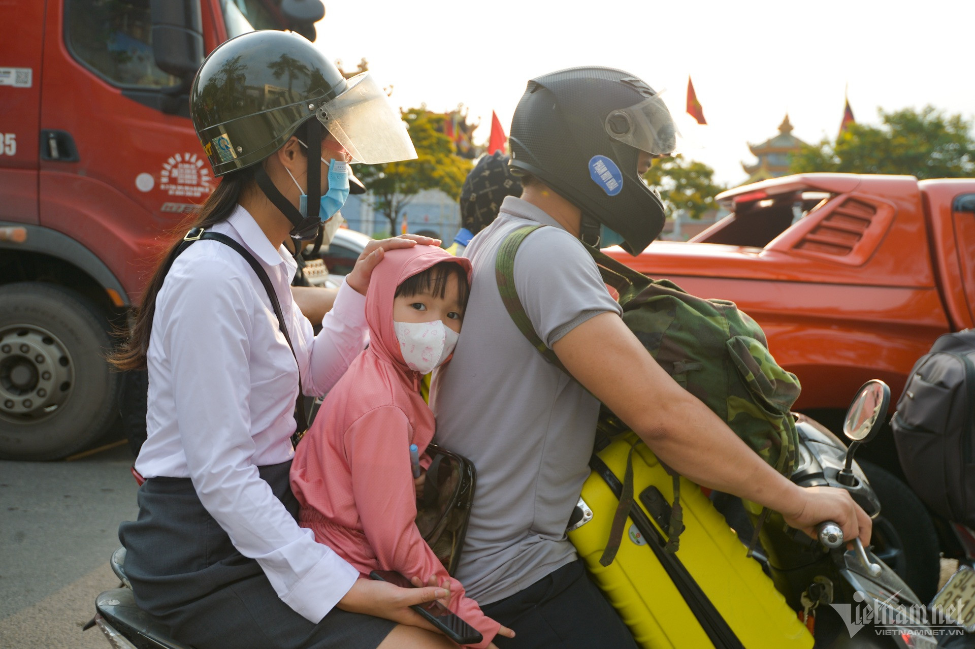 Gia đình chị Đặng Thị Hạnh trở về TP Phủ Lý (Hà Nam): “Đi quãng đường xa hơn 50km, nhiều lúc con tôi sẽ than mệt mỏi, thấy thương lắm nhưng cũng đành động viên cháu là sắp được gặp ông bà rồi”.