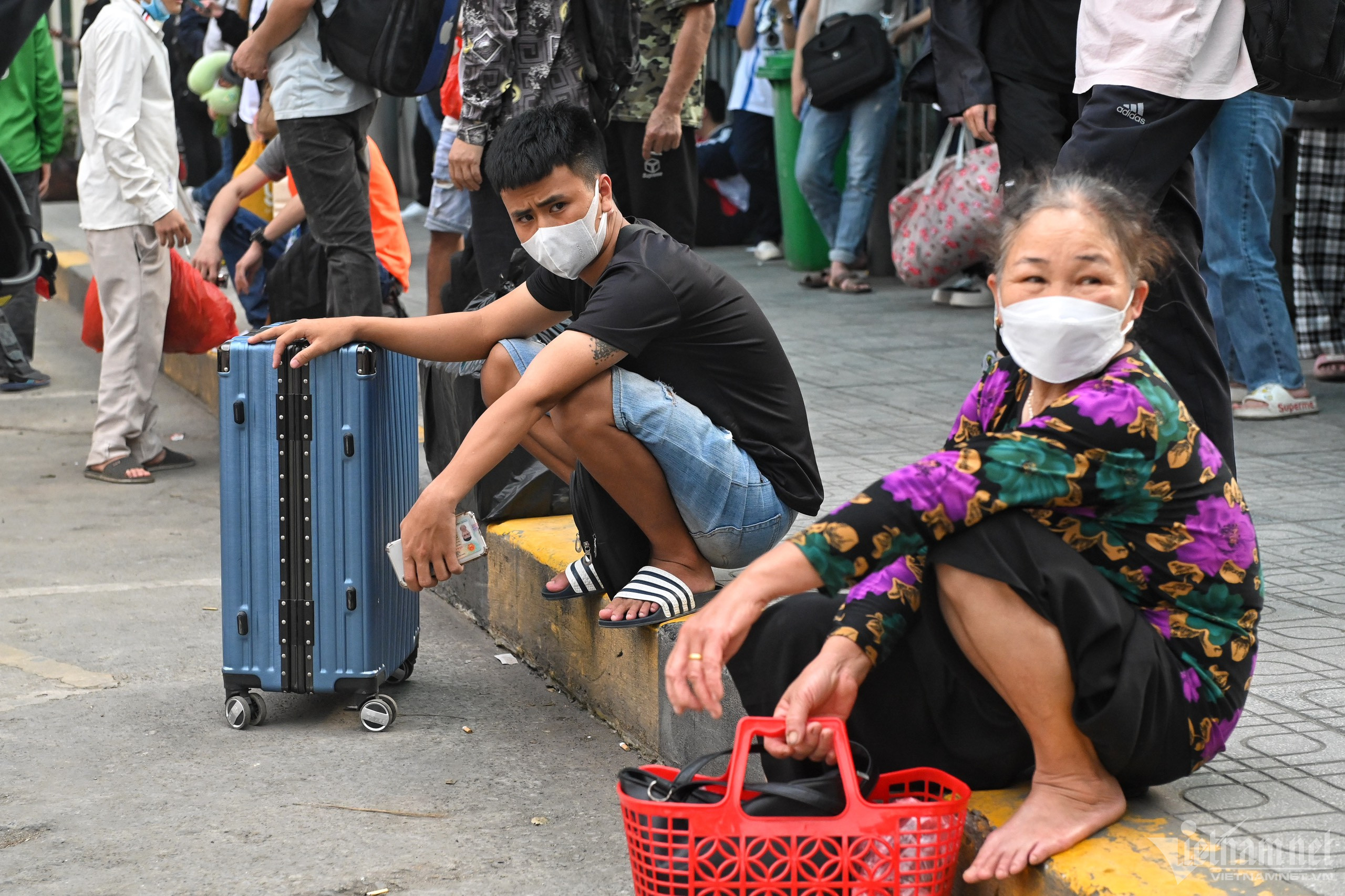 Nhiều người tay xách nách mang những túi hành lý đi tìm xe khách dọc đường.