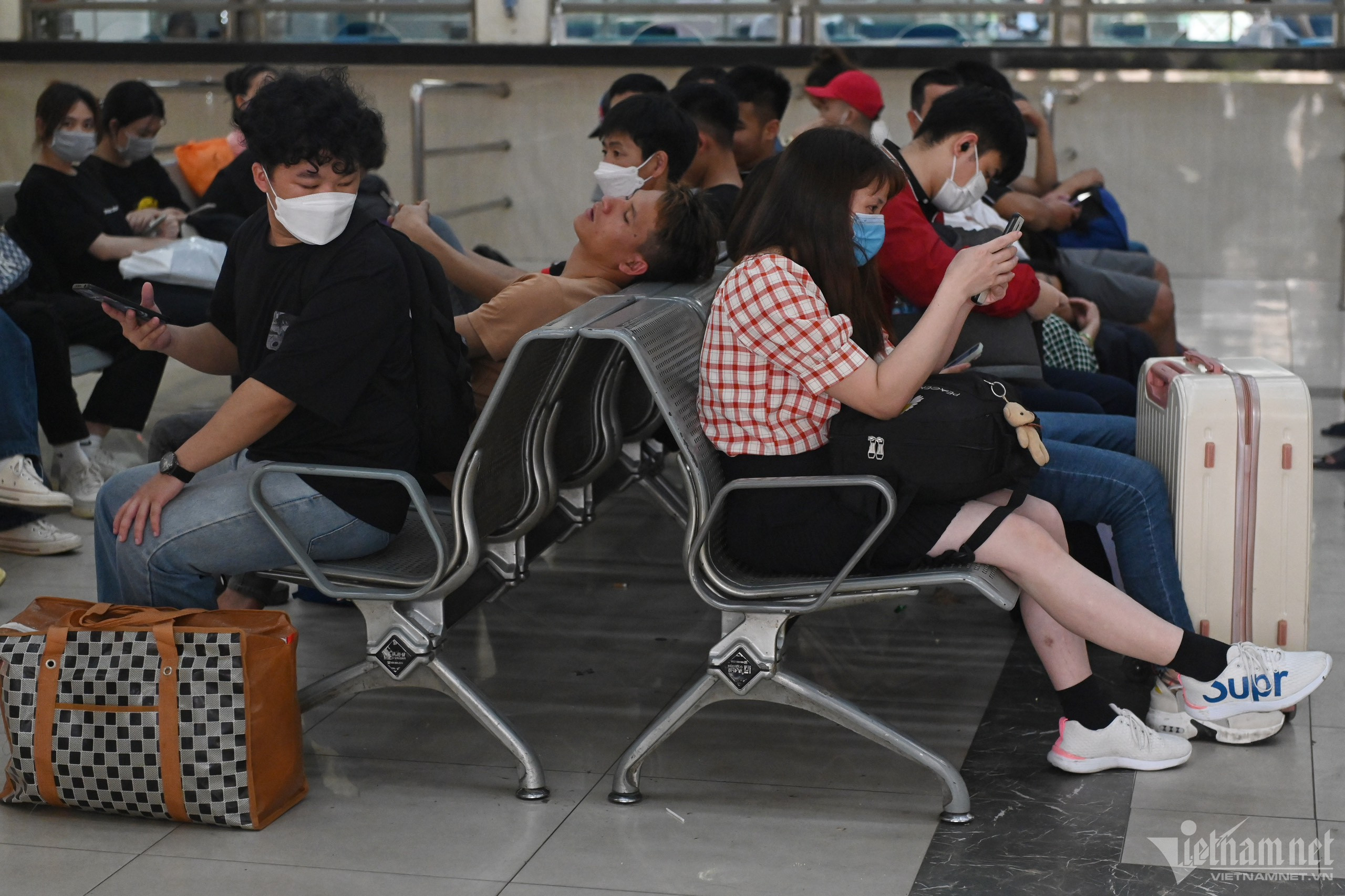 Bên trong bến xe Mỹ Đình, các ghế chờ chật kín người ngồi ngay từ 16h.
