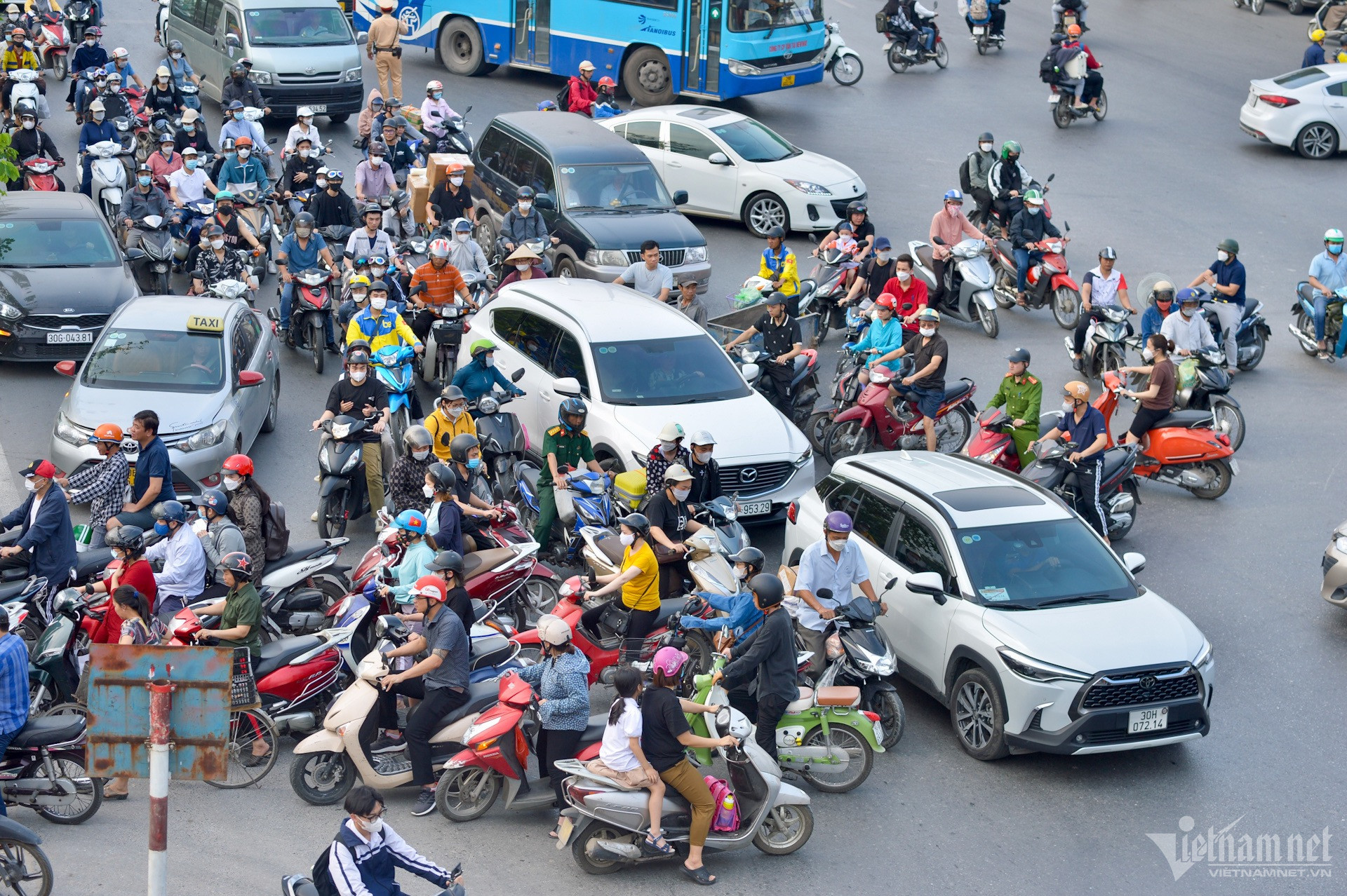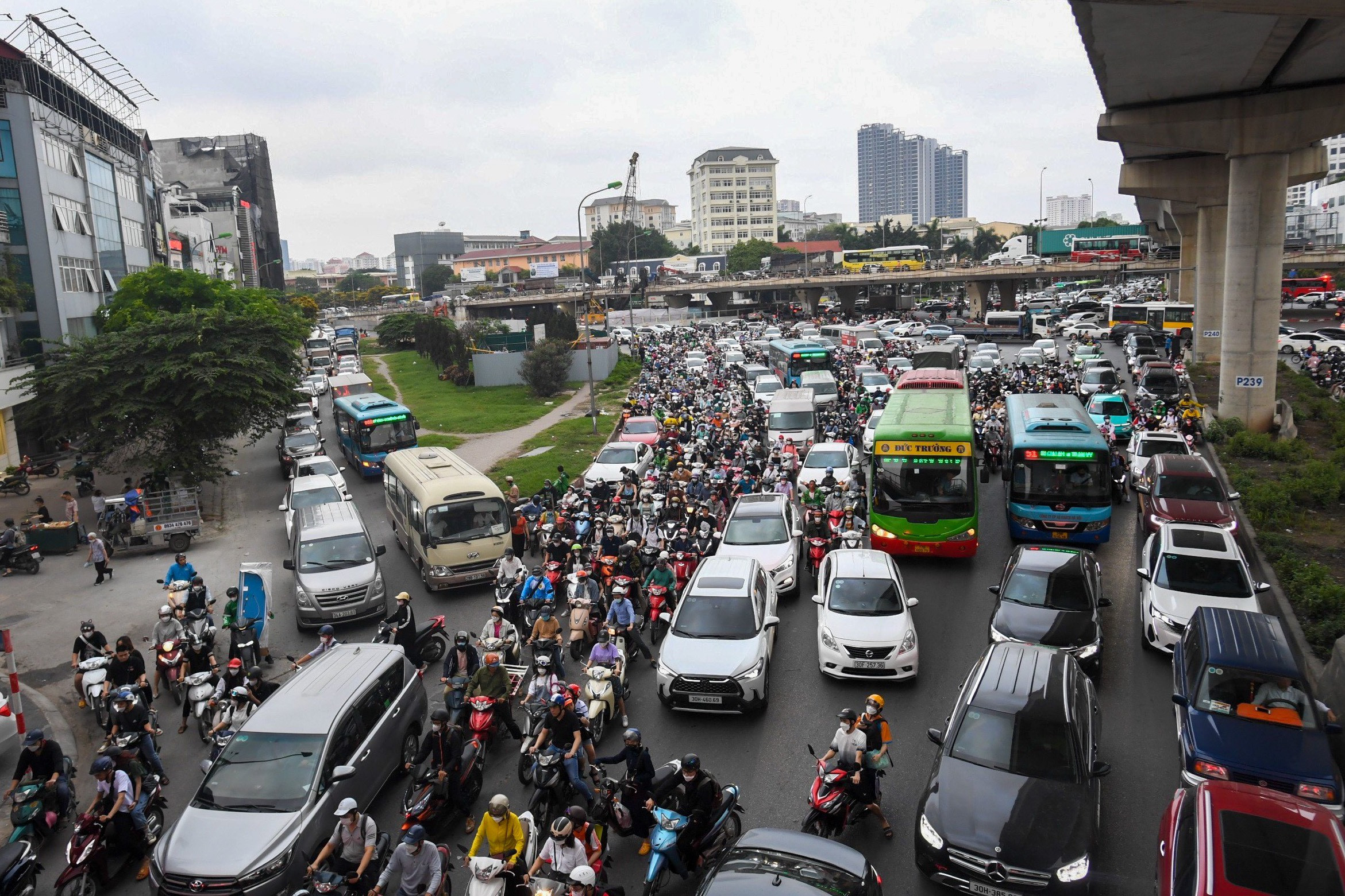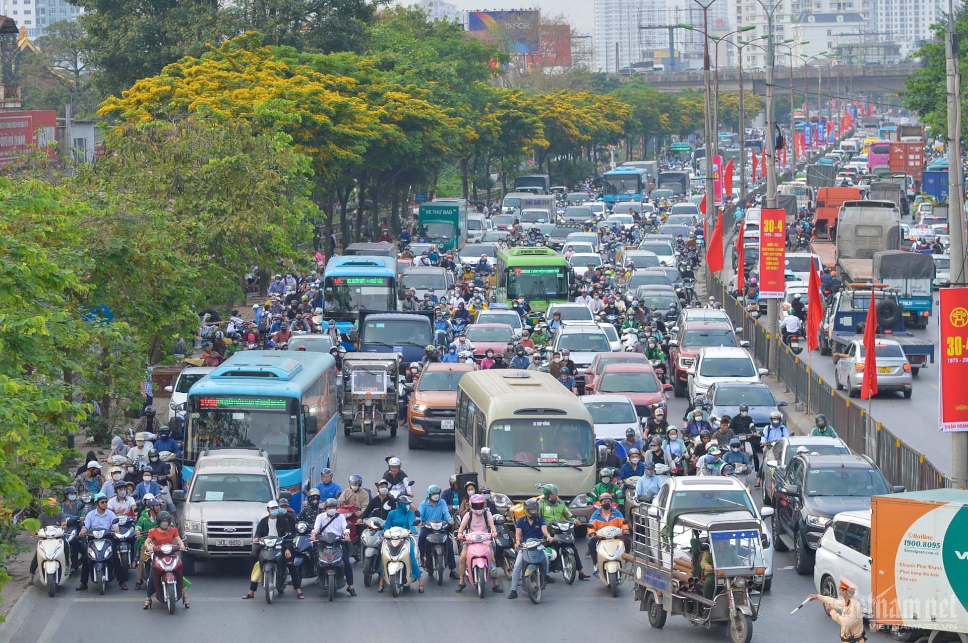 16h30, đường Khuất Duy Tiến (quận Thanh Xuân) tắc nghẽn nặng. Lúc này hàng nghìn người bắt đầu rời thủ đô về quê nghỉ lễ. Dòng phương tiện phần lớn từ phía nội thành đổ ra các cửa ngõ, phải di chuyển chậm.