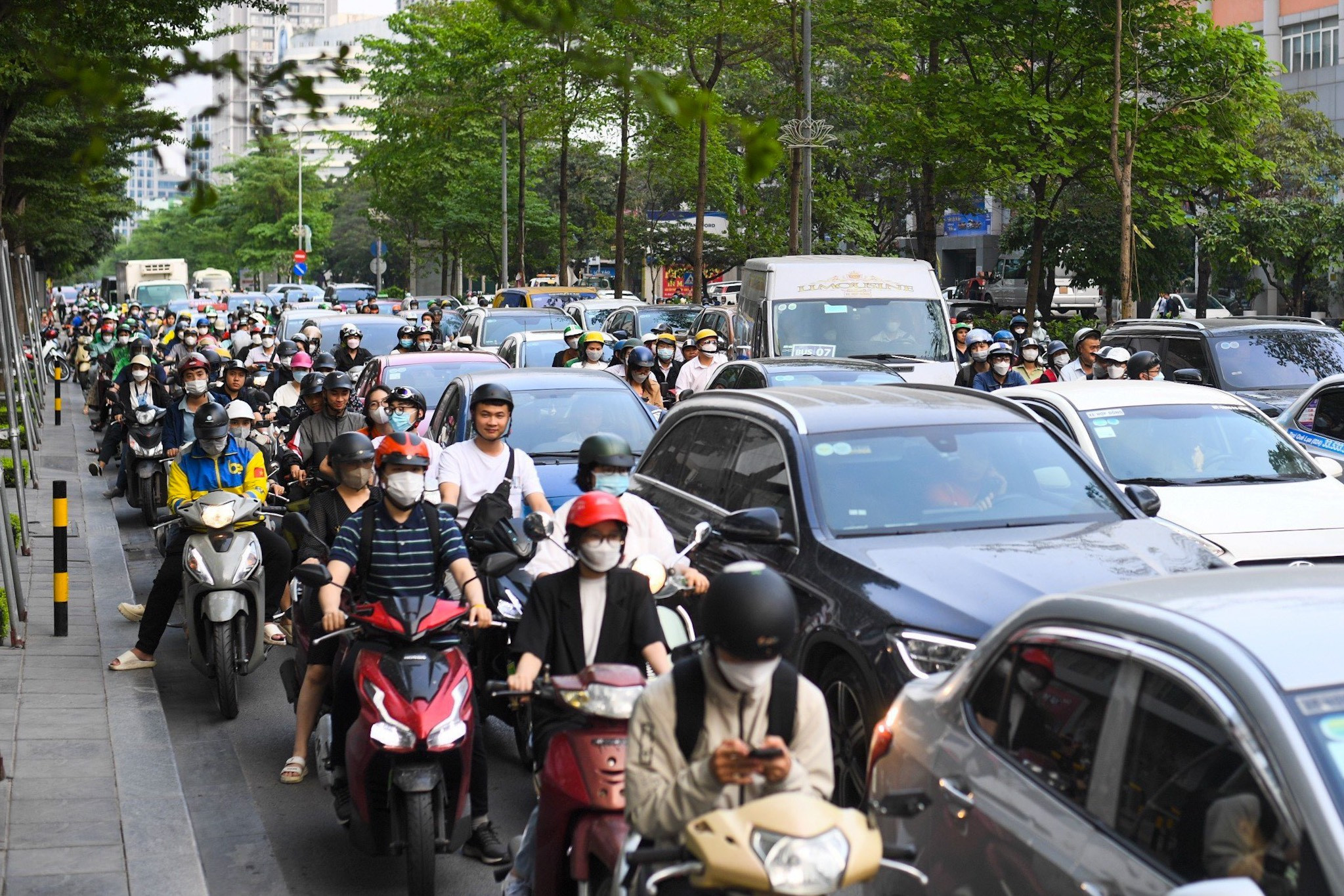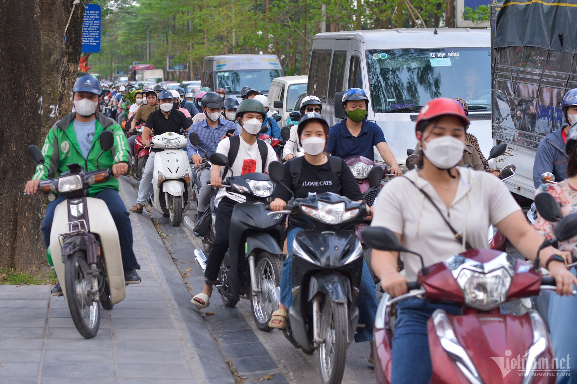 Đường Nguyễn Hoàng (quận Nam Từ Liêm) cũng ùn tắc kéo dài tới 3km. Đây là giờ cao điểm mà nhiều sinh viên, dân công sở tan làm đã tranh thủ về quê ngay.