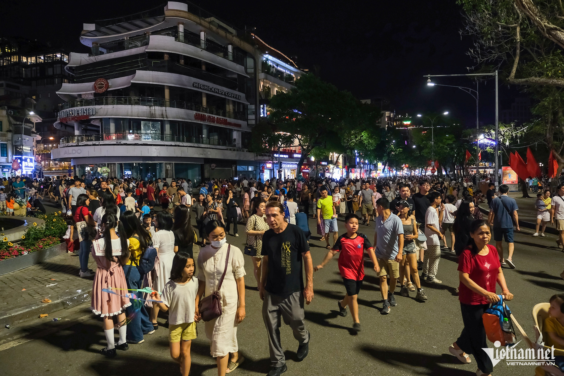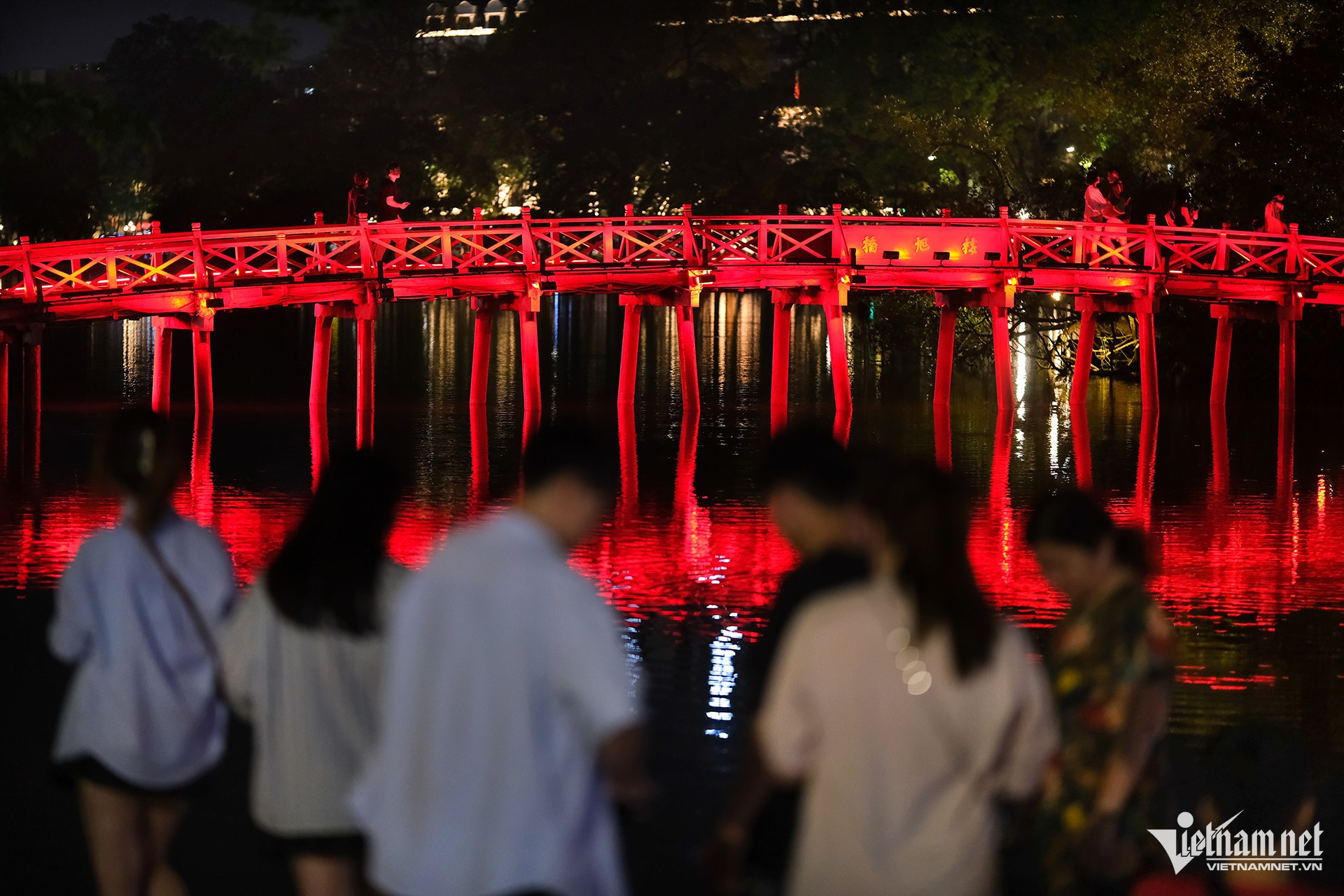 Tối 1/5, hàng nghìn người đổ về các tuyến phố đi bộ Tràng Tiền, Đinh Tiên Hoàng, Lê Thái Tổ, Hàng Khay bên hồ Gươm để dạo chơi, hóng mát, tận hưởng kỳ nghỉ lễ 30/4 - 1/5.