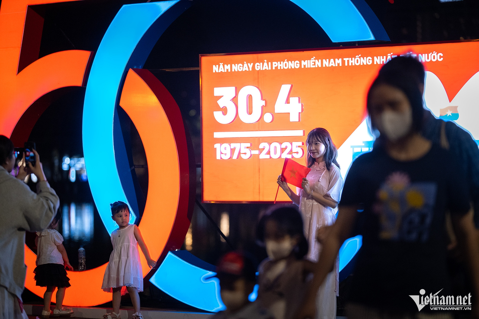Các mô hình trang trí lễ 30/4 trở thành những góc chụp ảnh hấp dẫn nhờ vào hiệu ứng chiếu sáng ban đêm.