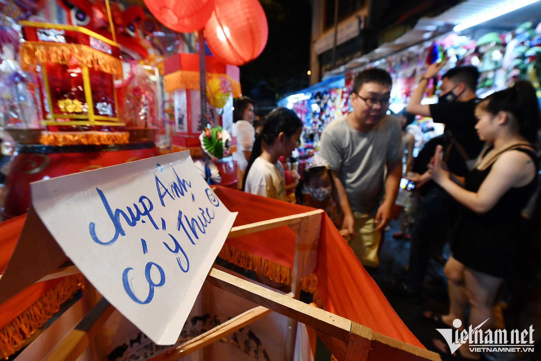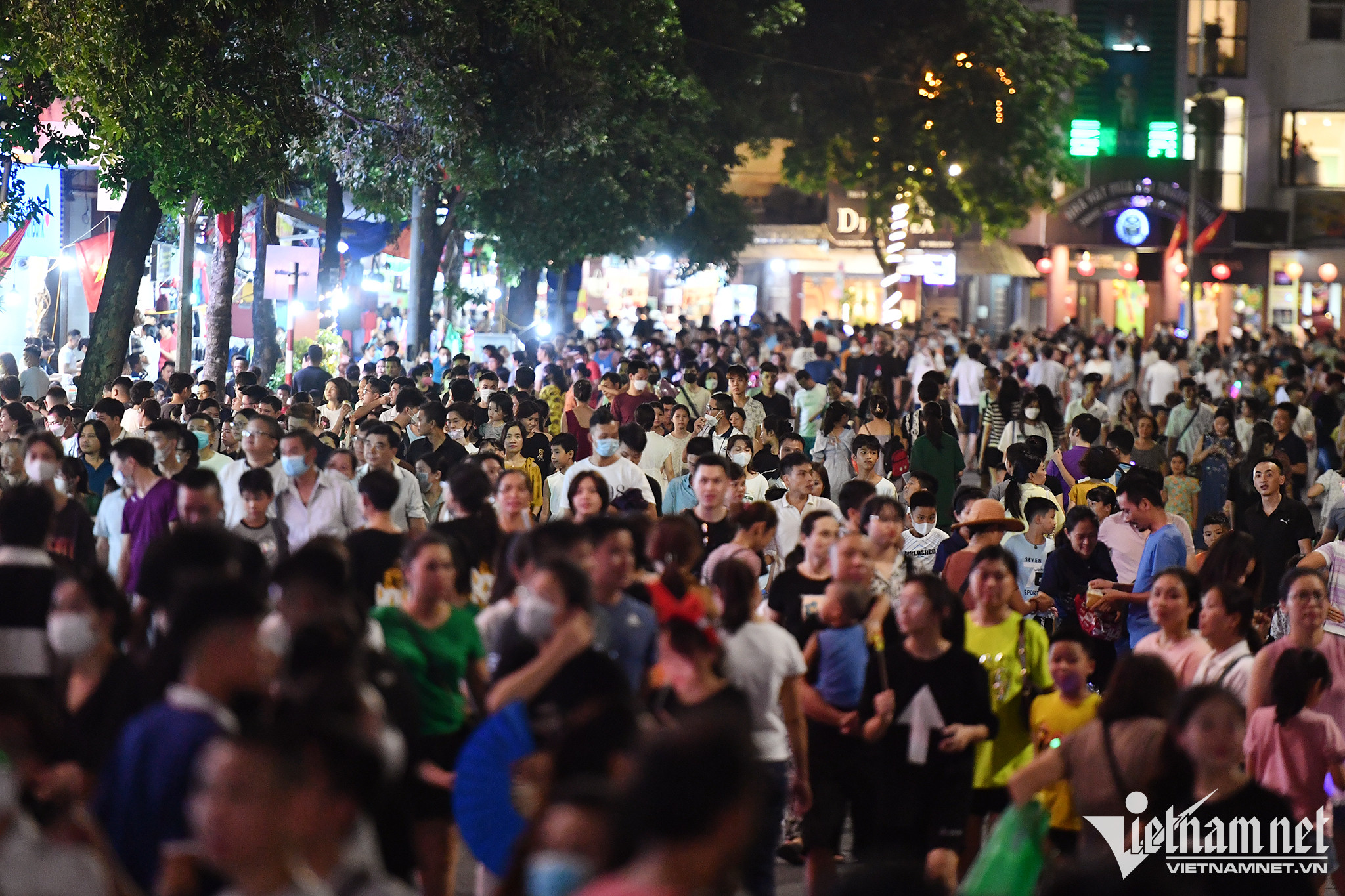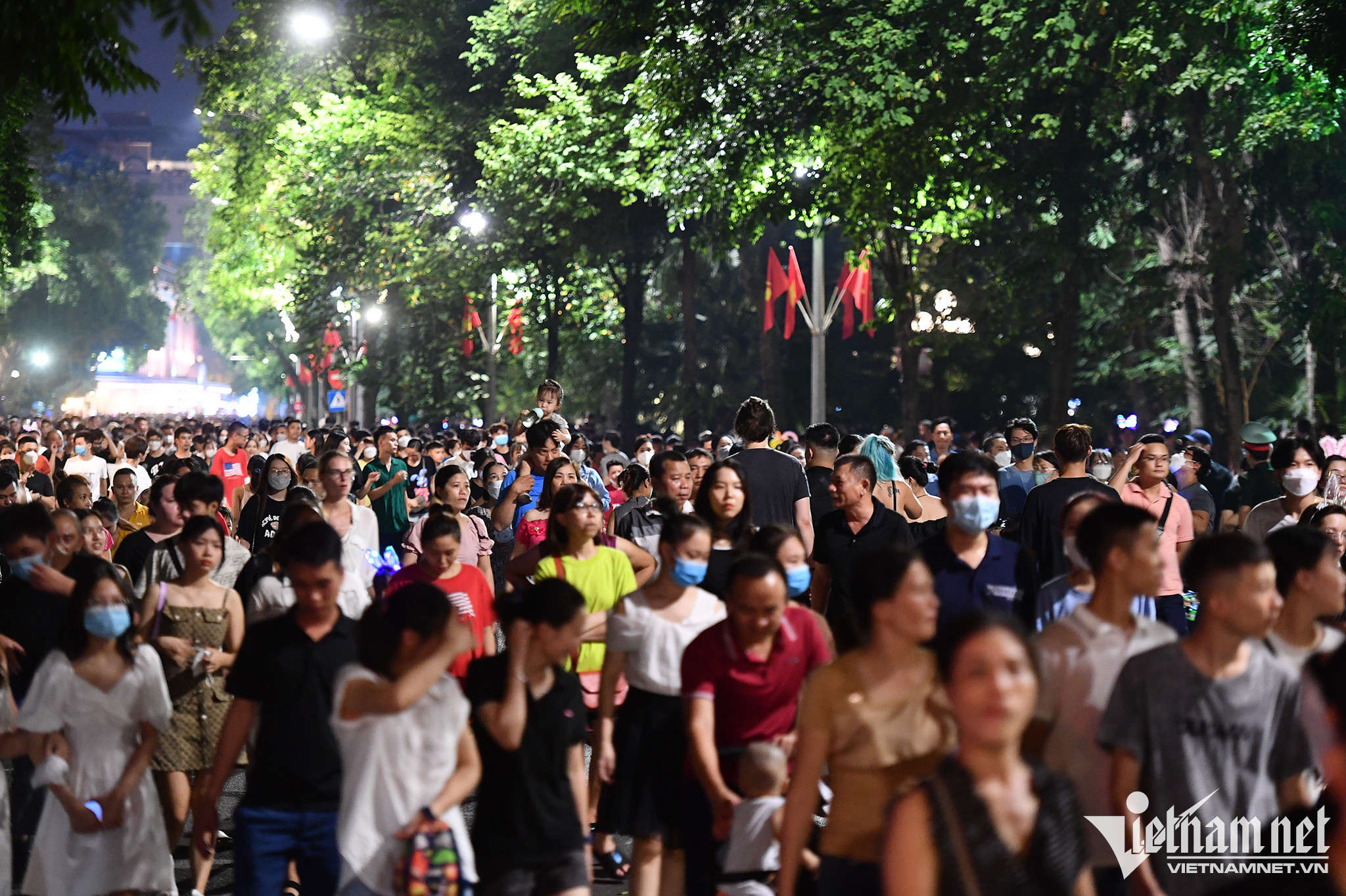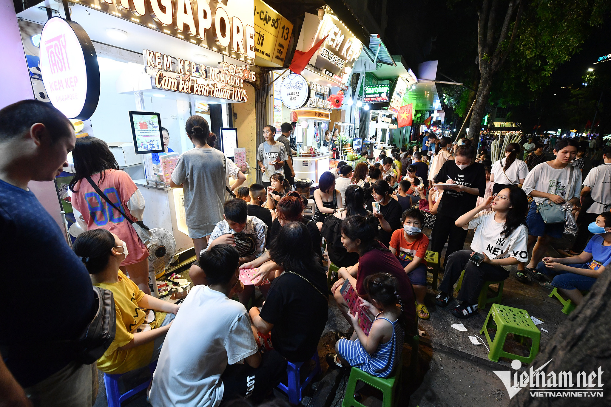 Phố Đinh Tiên Hoàng đoạn gần ngã ba Lê Lai từ sau 19h đến hơn 22h luôn trong tình trạng đông kín người.Dòng người tiến về phía quảng trường Đông Kinh Nghĩa thục lúc 20h30.Cảnh tương tự tại khu vực đền Bà Kiệu cùng thời điểm. Do có sân khấu biểu diễn các tiết mục mừng Quốc khánh tại ngã ba Hàng Dầu - Đinh Tiên Hoàng, lượng người đổ về đây đông hơn.Tại ngã ba Hàng Khay - Đinh Tiên Hoàng, tiết mục biểu diễn ca nhạc đường phố thu hút nhiều khán giả tập trung xem với các ca khúc được giới trẻ ưa thích.Các hàng kinh doanh ăn uống vỉa hè trung tâm thủ đô đông đúc khách, hầu như không quán nào còn chỗ trống.Hai cô gái cho biết, đang đi tìm quán cà phê có chỗ ngồi hợp lý nhưng hầu như những nơi ưng ý lại không có chỗ ngồi. Sự xuất hiện của các nghệ sĩ tại phố đi bộ hồ Gươm thu hút sự chú ý của nhiều người dân và du khách.Anh Hoàng và chị Hương thảnh thơi ngồi bệt uống nước gần đài phun nước. Anh chia sẻ do làm nghề lái tàu hỏa, ít có cơ hội nghỉ ngơi, hôm nay tranh thủ để con ở nhà và đưa vợ đi chơi. "Công việc bận rộn, lâu lắm chúng tôi mới có những phút thư giãn như thế này", anh Hoàng nói.Chị Lê Thanh (áo đỏ) cùng chồng và con gái lên trung tâm thủ đô chơi từ chiều tới tối. Chị cho biết cả nhà "nghiện" phố đi bộ, rất thường xuyên tới đây ăn uống và đi dạo. Dịp này, Tết Trung thu cũng sắp tới, hai mẹ con mua bộ tai thỏ đeo hóa trang để chụp ảnh.Anh Stefan (trái) và Dirk trong khi dạo chơi phố đi bộ đã thử một loại đồ chơi. Hai người đàn ông đến từ Đức, đang công tác tại Hải Phòng, dịp Quốc khánh tranh thủ về Hà Nội tham quan.Chợ Trung thu tại phố Hàng Mã cũng có lượng khách quá tải tối 3/9. Lưu thông ở khu vực này, nhiều người gặp khó khăn, các quầy hàng bán tràn ra vỉa hè và bầy cả ở giữa đường khiến lối đi bị thu hẹp.Phía chợ đồ chơi đoạn Hàng Lược cũng trong tình trạng tương tự. Người đi dạo thì nhiều, chọn mua đồ chơi Trung thu lại khá ít. Phần lớn người bán hàng ngồi không nhìn khách đi qua.Nhiều người chủ vốn không bán được hàng lại gặp cảnh giới trẻ thi nhau nhảy vào sạp tạo dáng nên đã viết tấm bảng cảnh báo.Trong khi đó các hàng bán quà vặt rất đông khách. Nhiều người đi chợ đồ chơi Trung thu nhưng chỉ để... ăn.Các hàng kinh doanh ăn uống ngày thường dịp này cũng nhường vỉa hè cho người khác hoặc tự bán thêm đồ chơi Trung thu.Một hàng chè bày ngay trước gian hàng đồ chơi. Khách thưởng thức ẩm thực đông đúc, người mua đầu lân, đèn ông sao hầu như không có. Anh Kiều Anh Tuấn và vợ đưa con đi mua đồ chơi truyền thống. Sau một hồi lựa chọn, hai bé thích thú và chọn chiếc đèn ông sao.Một thanh niên trong trang phục Tôn Ngộ Không cầm gậy đi dọc phố Hàng Lược. Nếu em nhỏ nào muốn chụp ảnh với "lão Tôn" đều phải mua kẹo.