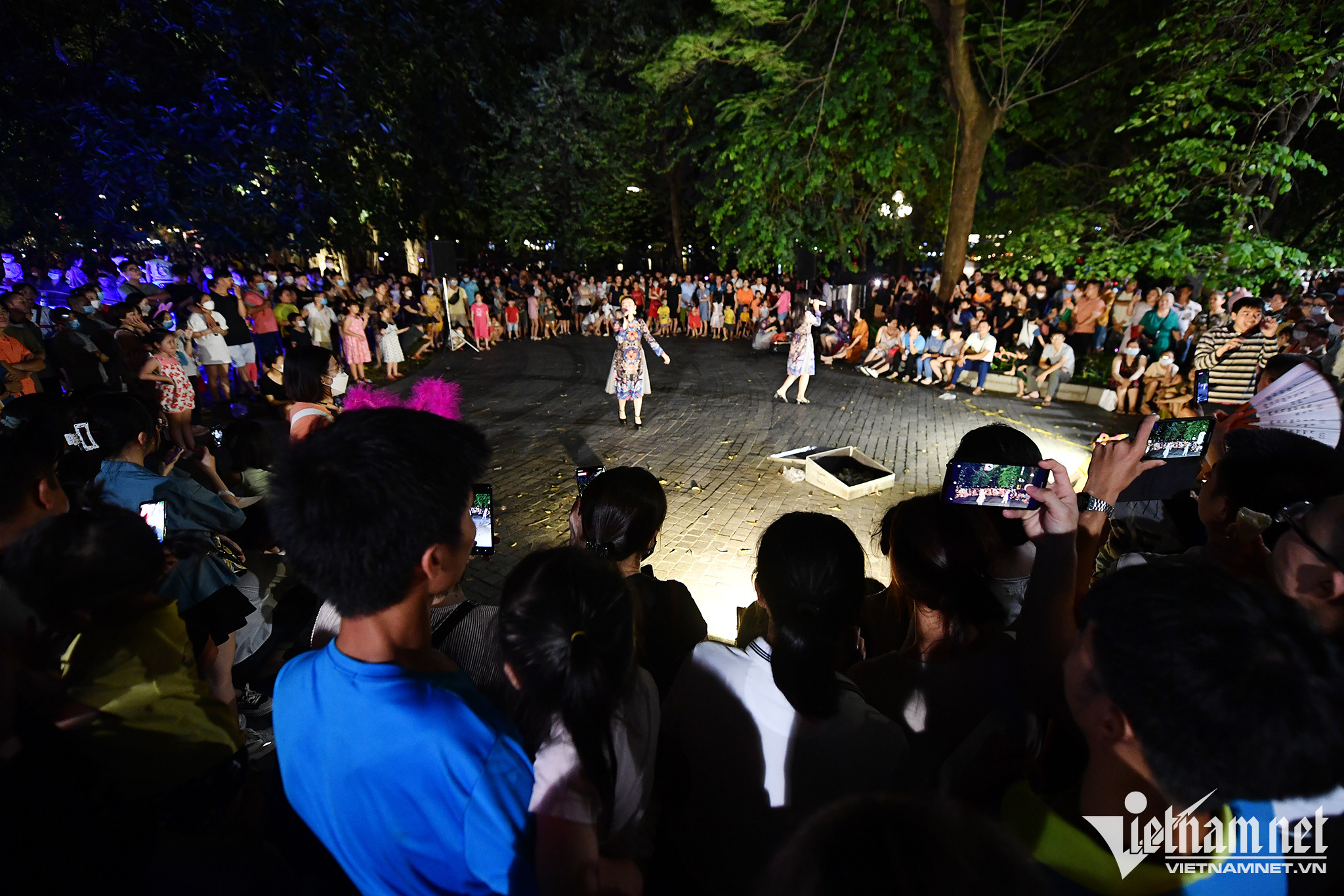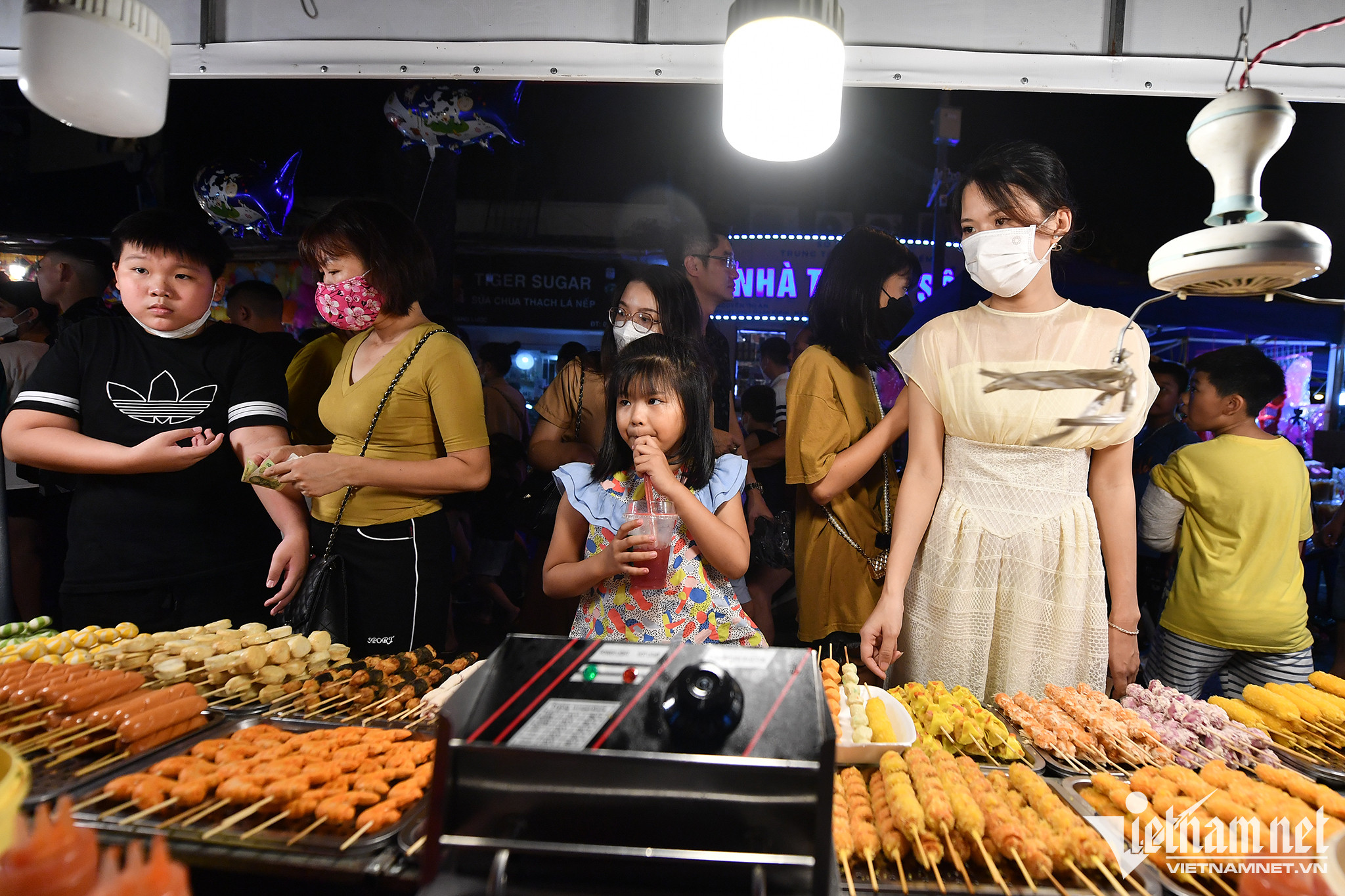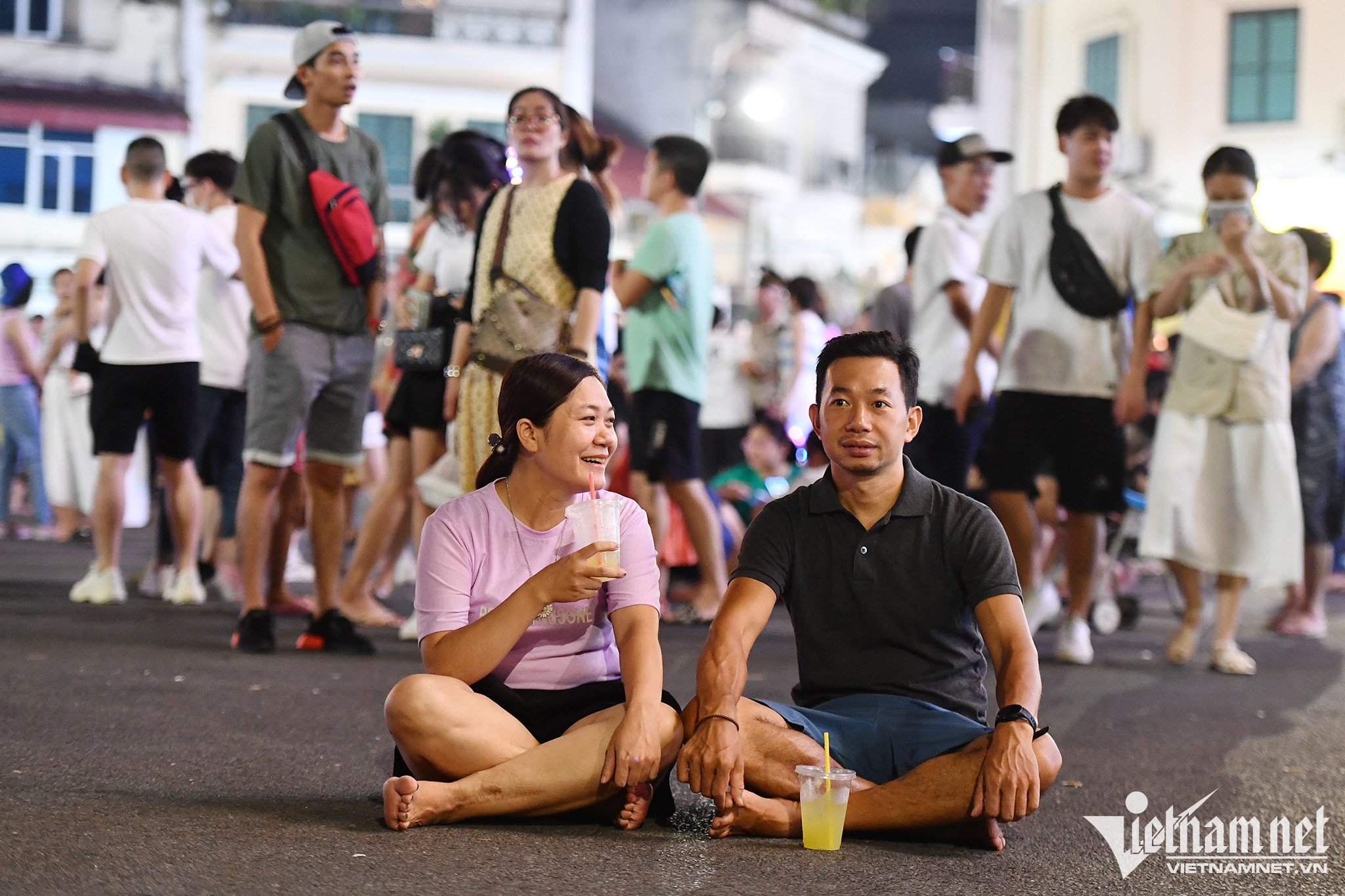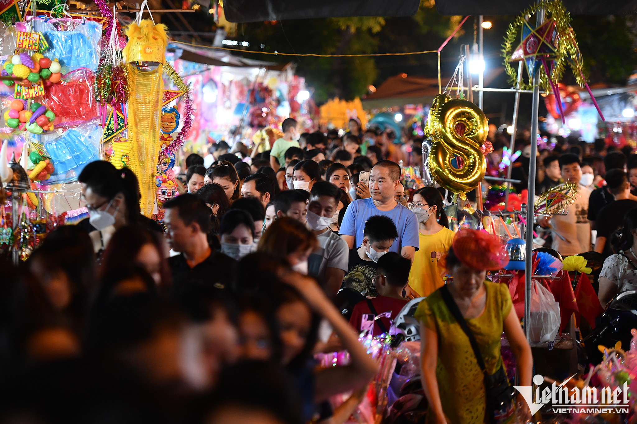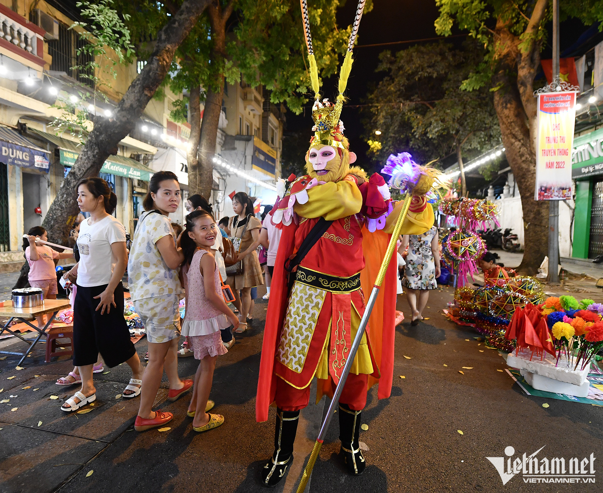 Phố Đinh Tiên Hoàng đoạn gần ngã ba Lê Lai từ sau 19h đến hơn 22h luôn trong tình trạng đông kín người.Dòng người tiến về phía quảng trường Đông Kinh Nghĩa thục lúc 20h30.Cảnh tương tự tại khu vực đền Bà Kiệu cùng thời điểm. Do có sân khấu biểu diễn các tiết mục mừng Quốc khánh tại ngã ba Hàng Dầu - Đinh Tiên Hoàng, lượng người đổ về đây đông hơn.Tại ngã ba Hàng Khay - Đinh Tiên Hoàng, tiết mục biểu diễn ca nhạc đường phố thu hút nhiều khán giả tập trung xem với các ca khúc được giới trẻ ưa thích.Các hàng kinh doanh ăn uống vỉa hè trung tâm thủ đô đông đúc khách, hầu như không quán nào còn chỗ trống.Hai cô gái cho biết, đang đi tìm quán cà phê có chỗ ngồi hợp lý nhưng hầu như những nơi ưng ý lại không có chỗ ngồi. Sự xuất hiện của các nghệ sĩ tại phố đi bộ hồ Gươm thu hút sự chú ý của nhiều người dân và du khách.Anh Hoàng và chị Hương thảnh thơi ngồi bệt uống nước gần đài phun nước. Anh chia sẻ do làm nghề lái tàu hỏa, ít có cơ hội nghỉ ngơi, hôm nay tranh thủ để con ở nhà và đưa vợ đi chơi. "Công việc bận rộn, lâu lắm chúng tôi mới có những phút thư giãn như thế này", anh Hoàng nói.Chị Lê Thanh (áo đỏ) cùng chồng và con gái lên trung tâm thủ đô chơi từ chiều tới tối. Chị cho biết cả nhà "nghiện" phố đi bộ, rất thường xuyên tới đây ăn uống và đi dạo. Dịp này, Tết Trung thu cũng sắp tới, hai mẹ con mua bộ tai thỏ đeo hóa trang để chụp ảnh.Anh Stefan (trái) và Dirk trong khi dạo chơi phố đi bộ đã thử một loại đồ chơi. Hai người đàn ông đến từ Đức, đang công tác tại Hải Phòng, dịp Quốc khánh tranh thủ về Hà Nội tham quan.Chợ Trung thu tại phố Hàng Mã cũng có lượng khách quá tải tối 3/9. Lưu thông ở khu vực này, nhiều người gặp khó khăn, các quầy hàng bán tràn ra vỉa hè và bầy cả ở giữa đường khiến lối đi bị thu hẹp.Phía chợ đồ chơi đoạn Hàng Lược cũng trong tình trạng tương tự. Người đi dạo thì nhiều, chọn mua đồ chơi Trung thu lại khá ít. Phần lớn người bán hàng ngồi không nhìn khách đi qua.Nhiều người chủ vốn không bán được hàng lại gặp cảnh giới trẻ thi nhau nhảy vào sạp tạo dáng nên đã viết tấm bảng cảnh báo.Trong khi đó các hàng bán quà vặt rất đông khách. Nhiều người đi chợ đồ chơi Trung thu nhưng chỉ để... ăn.Các hàng kinh doanh ăn uống ngày thường dịp này cũng nhường vỉa hè cho người khác hoặc tự bán thêm đồ chơi Trung thu.Một hàng chè bày ngay trước gian hàng đồ chơi. Khách thưởng thức ẩm thực đông đúc, người mua đầu lân, đèn ông sao hầu như không có. Anh Kiều Anh Tuấn và vợ đưa con đi mua đồ chơi truyền thống. Sau một hồi lựa chọn, hai bé thích thú và chọn chiếc đèn ông sao.Một thanh niên trong trang phục Tôn Ngộ Không cầm gậy đi dọc phố Hàng Lược. Nếu em nhỏ nào muốn chụp ảnh với "lão Tôn" đều phải mua kẹo.