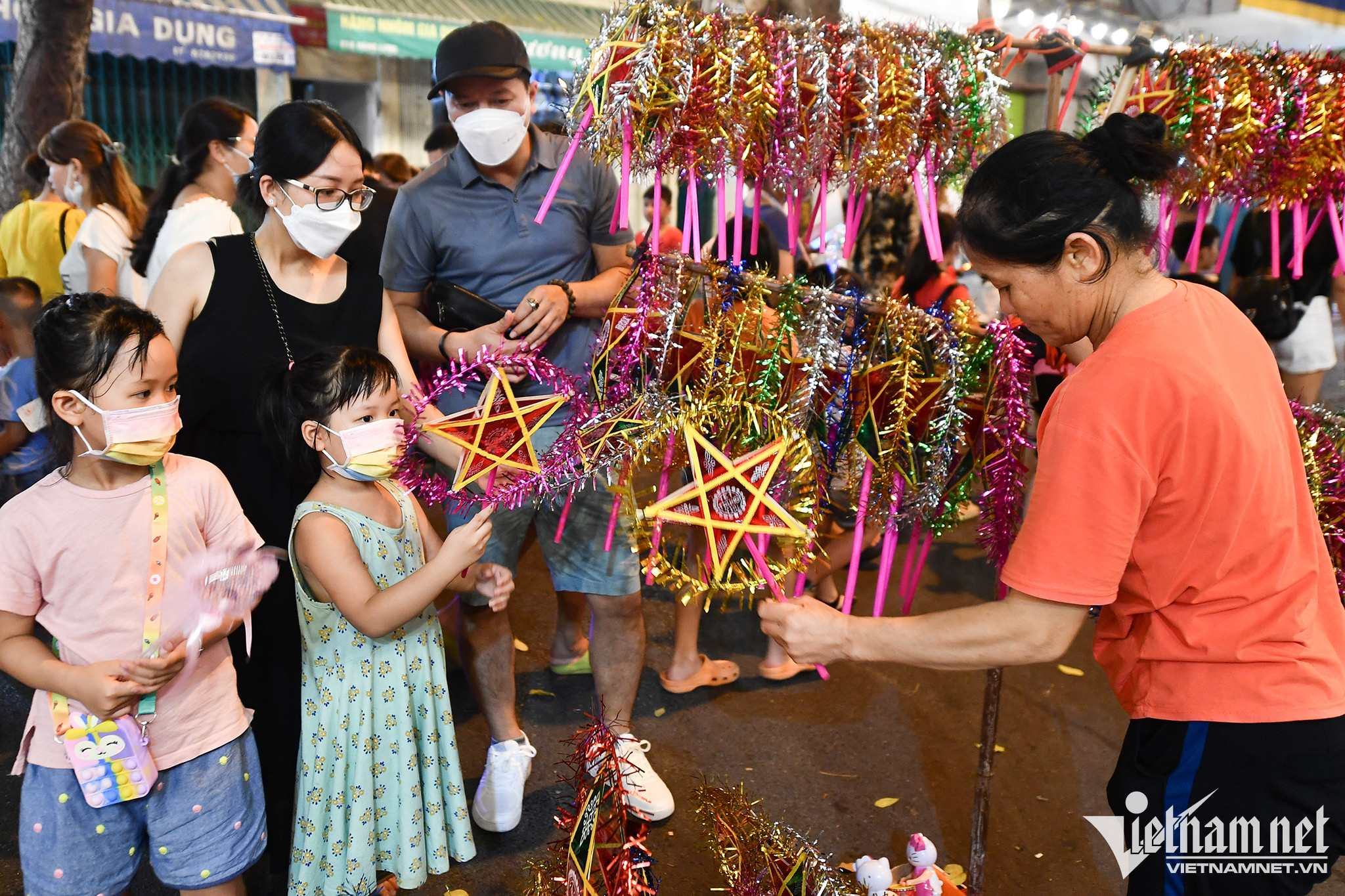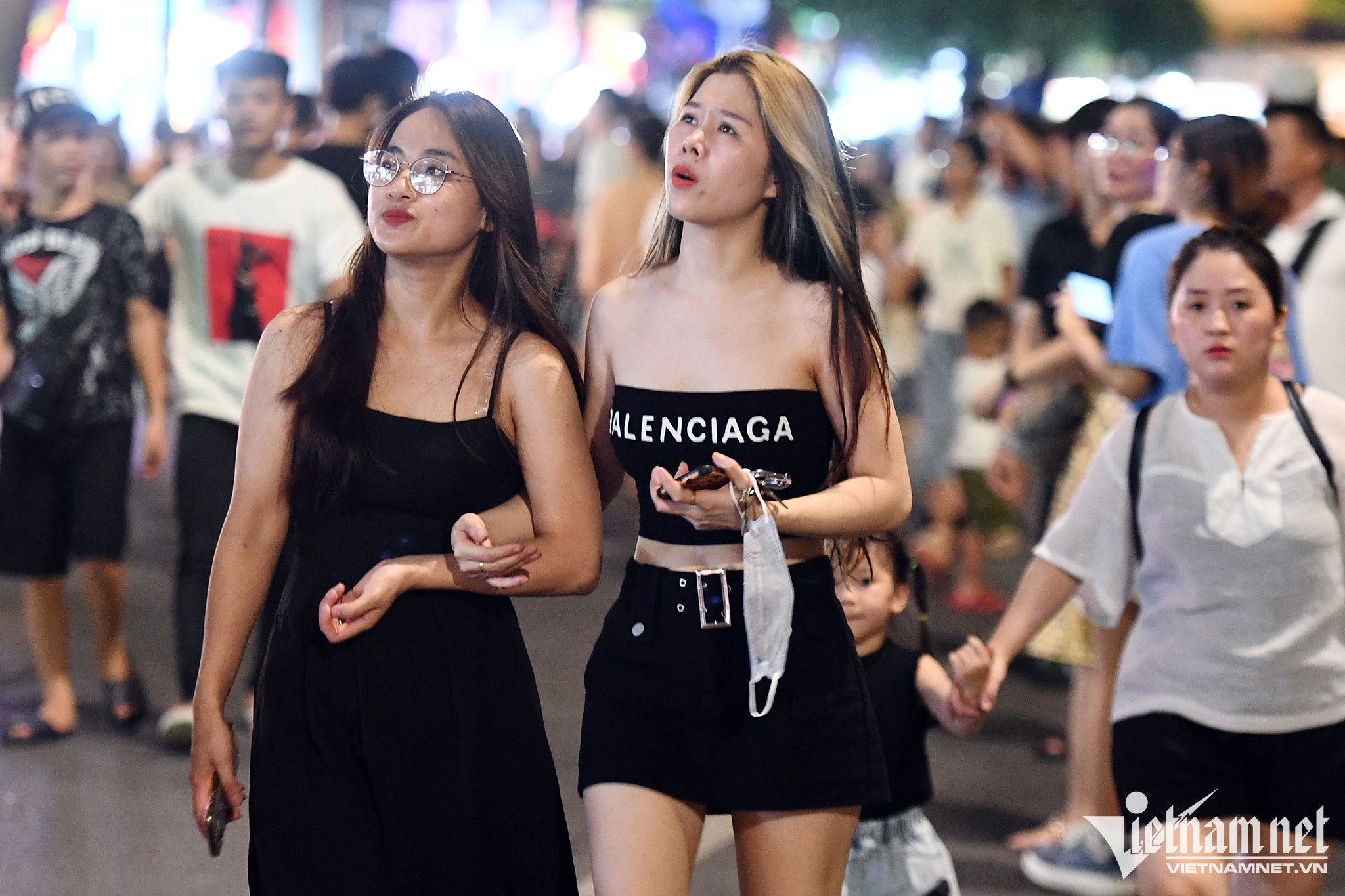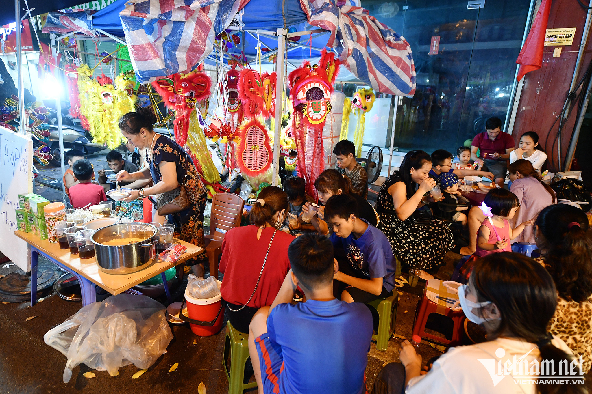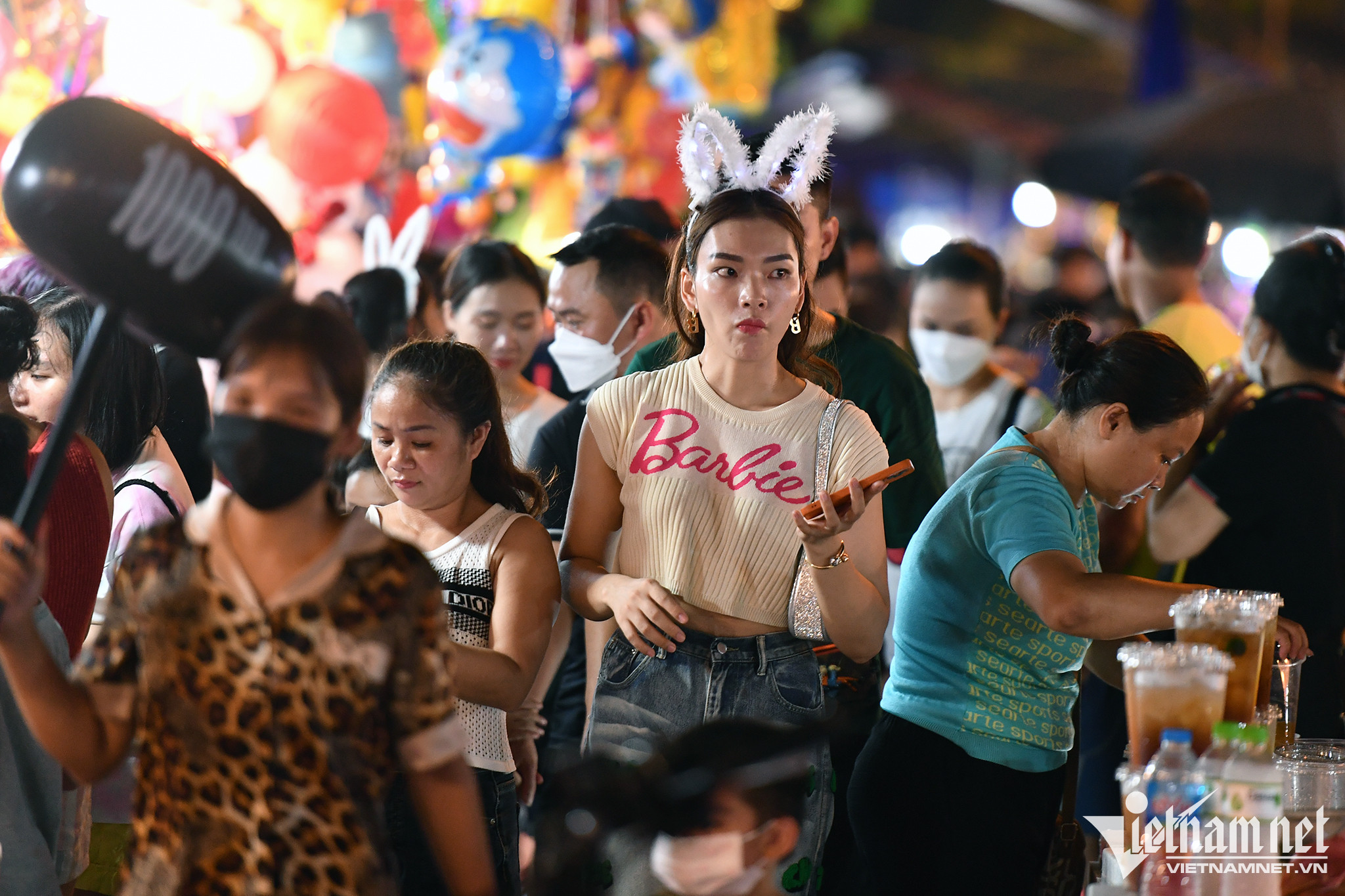 Phố Đinh Tiên Hoàng đoạn gần ngã ba Lê Lai từ sau 19h đến hơn 22h luôn trong tình trạng đông kín người.Dòng người tiến về phía quảng trường Đông Kinh Nghĩa thục lúc 20h30.Cảnh tương tự tại khu vực đền Bà Kiệu cùng thời điểm. Do có sân khấu biểu diễn các tiết mục mừng Quốc khánh tại ngã ba Hàng Dầu - Đinh Tiên Hoàng, lượng người đổ về đây đông hơn.Tại ngã ba Hàng Khay - Đinh Tiên Hoàng, tiết mục biểu diễn ca nhạc đường phố thu hút nhiều khán giả tập trung xem với các ca khúc được giới trẻ ưa thích.Các hàng kinh doanh ăn uống vỉa hè trung tâm thủ đô đông đúc khách, hầu như không quán nào còn chỗ trống.Hai cô gái cho biết, đang đi tìm quán cà phê có chỗ ngồi hợp lý nhưng hầu như những nơi ưng ý lại không có chỗ ngồi. Sự xuất hiện của các nghệ sĩ tại phố đi bộ hồ Gươm thu hút sự chú ý của nhiều người dân và du khách.Anh Hoàng và chị Hương thảnh thơi ngồi bệt uống nước gần đài phun nước. Anh chia sẻ do làm nghề lái tàu hỏa, ít có cơ hội nghỉ ngơi, hôm nay tranh thủ để con ở nhà và đưa vợ đi chơi. "Công việc bận rộn, lâu lắm chúng tôi mới có những phút thư giãn như thế này", anh Hoàng nói.Chị Lê Thanh (áo đỏ) cùng chồng và con gái lên trung tâm thủ đô chơi từ chiều tới tối. Chị cho biết cả nhà "nghiện" phố đi bộ, rất thường xuyên tới đây ăn uống và đi dạo. Dịp này, Tết Trung thu cũng sắp tới, hai mẹ con mua bộ tai thỏ đeo hóa trang để chụp ảnh.Anh Stefan (trái) và Dirk trong khi dạo chơi phố đi bộ đã thử một loại đồ chơi. Hai người đàn ông đến từ Đức, đang công tác tại Hải Phòng, dịp Quốc khánh tranh thủ về Hà Nội tham quan.Chợ Trung thu tại phố Hàng Mã cũng có lượng khách quá tải tối 3/9. Lưu thông ở khu vực này, nhiều người gặp khó khăn, các quầy hàng bán tràn ra vỉa hè và bầy cả ở giữa đường khiến lối đi bị thu hẹp.Phía chợ đồ chơi đoạn Hàng Lược cũng trong tình trạng tương tự. Người đi dạo thì nhiều, chọn mua đồ chơi Trung thu lại khá ít. Phần lớn người bán hàng ngồi không nhìn khách đi qua.Nhiều người chủ vốn không bán được hàng lại gặp cảnh giới trẻ thi nhau nhảy vào sạp tạo dáng nên đã viết tấm bảng cảnh báo.Trong khi đó các hàng bán quà vặt rất đông khách. Nhiều người đi chợ đồ chơi Trung thu nhưng chỉ để... ăn.Các hàng kinh doanh ăn uống ngày thường dịp này cũng nhường vỉa hè cho người khác hoặc tự bán thêm đồ chơi Trung thu.Một hàng chè bày ngay trước gian hàng đồ chơi. Khách thưởng thức ẩm thực đông đúc, người mua đầu lân, đèn ông sao hầu như không có. Anh Kiều Anh Tuấn và vợ đưa con đi mua đồ chơi truyền thống. Sau một hồi lựa chọn, hai bé thích thú và chọn chiếc đèn ông sao.Một thanh niên trong trang phục Tôn Ngộ Không cầm gậy đi dọc phố Hàng Lược. Nếu em nhỏ nào muốn chụp ảnh với "lão Tôn" đều phải mua kẹo.