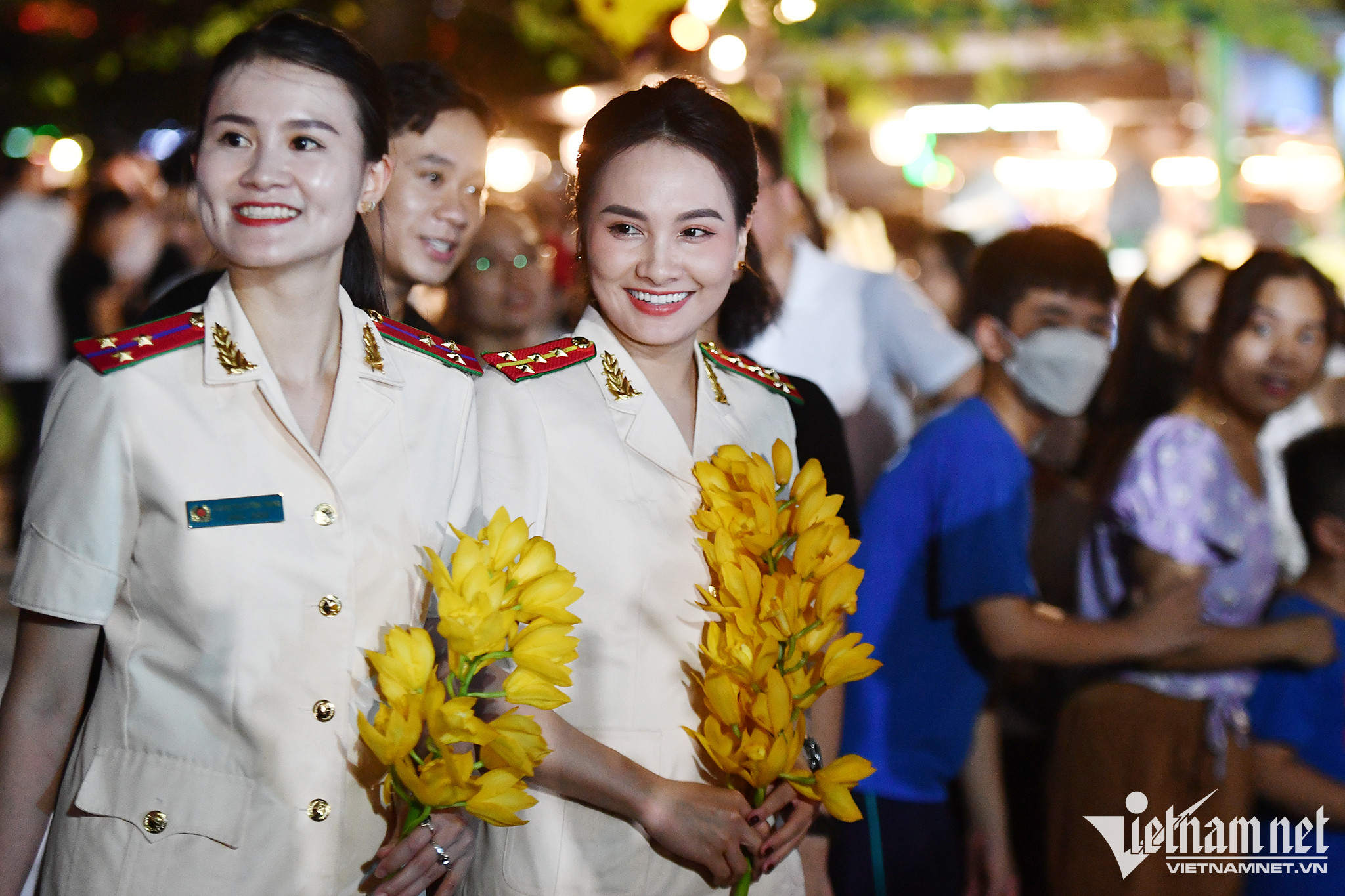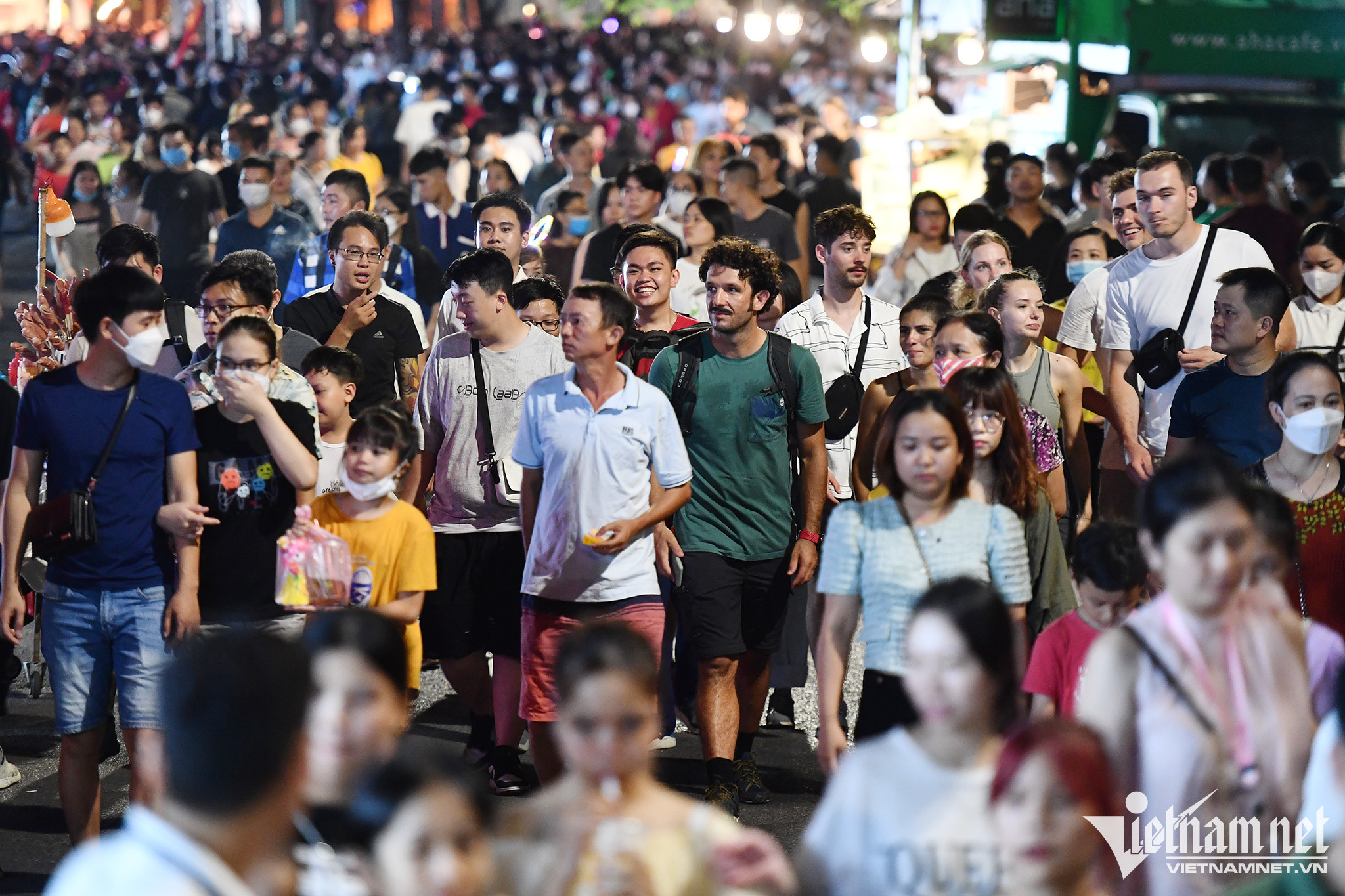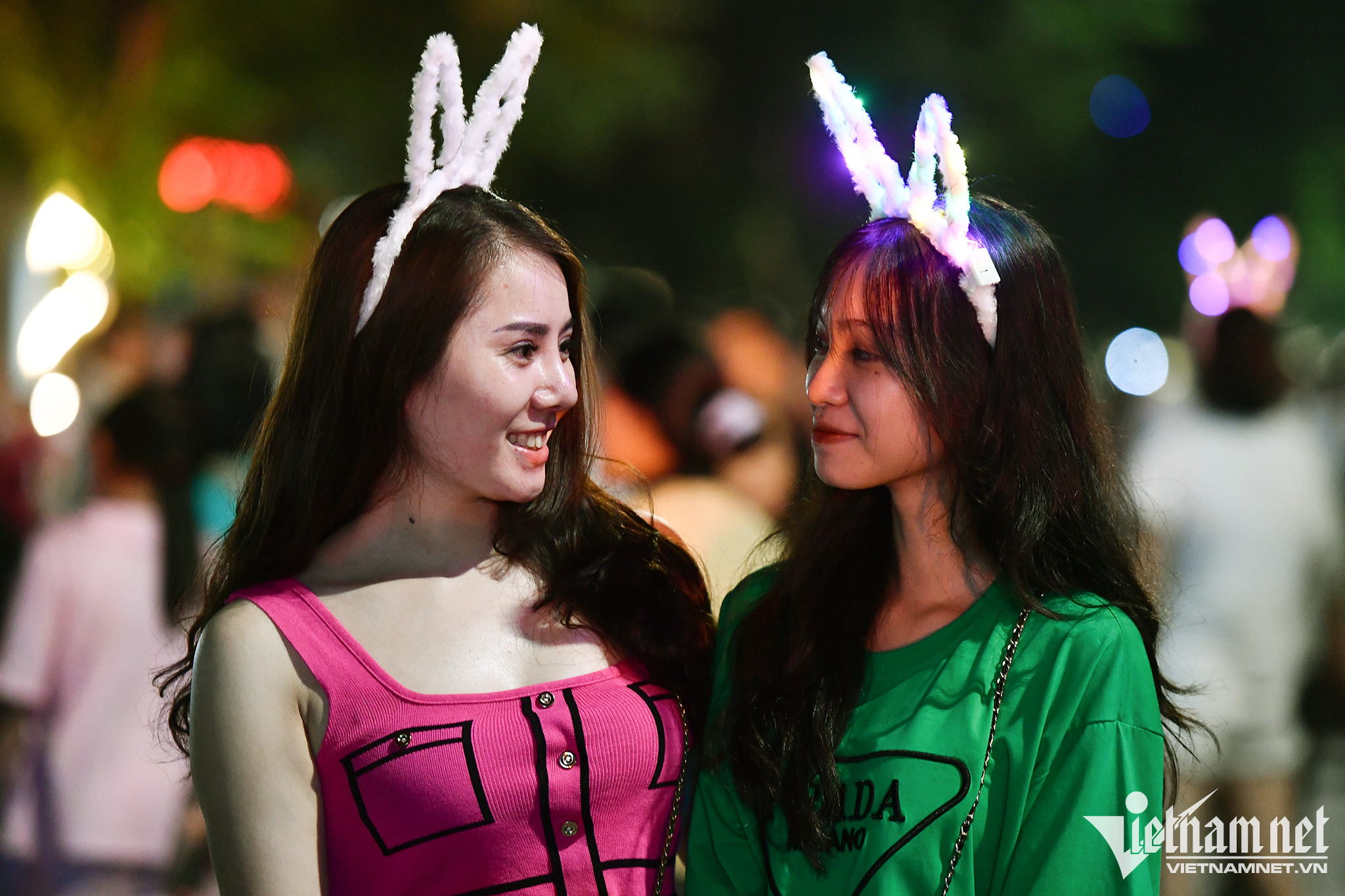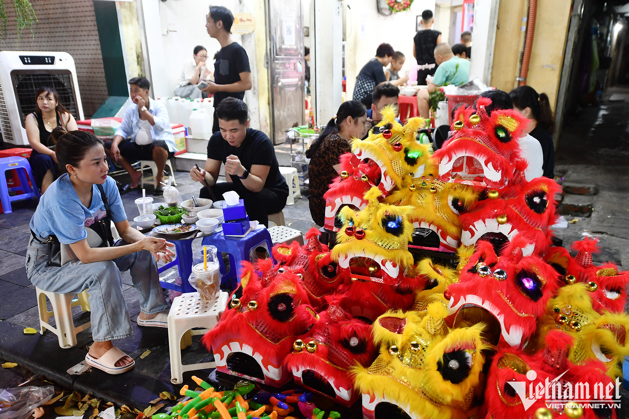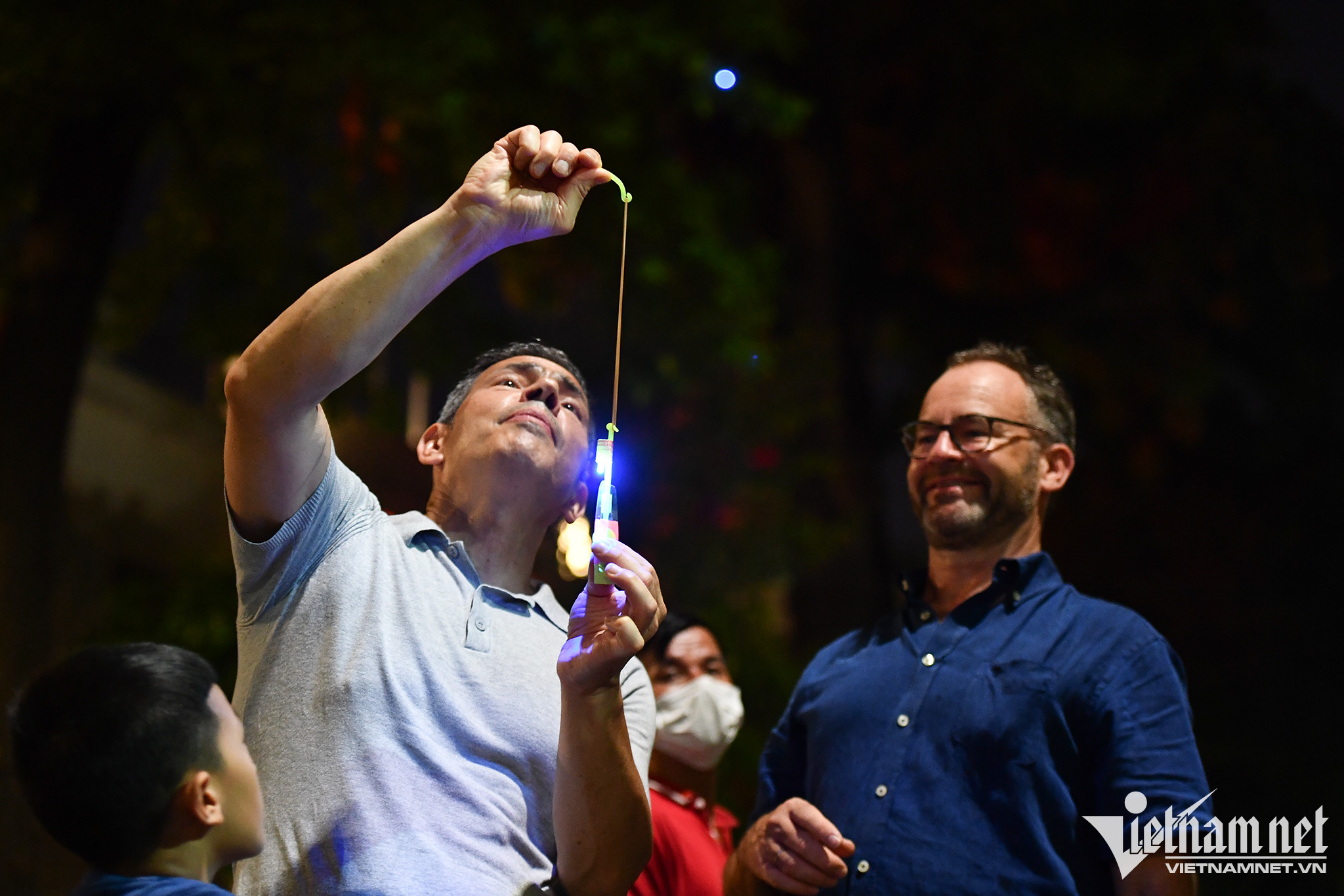 Phố Đinh Tiên Hoàng đoạn gần ngã ba Lê Lai từ sau 19h đến hơn 22h luôn trong tình trạng đông kín người.Dòng người tiến về phía quảng trường Đông Kinh Nghĩa thục lúc 20h30.Cảnh tương tự tại khu vực đền Bà Kiệu cùng thời điểm. Do có sân khấu biểu diễn các tiết mục mừng Quốc khánh tại ngã ba Hàng Dầu - Đinh Tiên Hoàng, lượng người đổ về đây đông hơn.Tại ngã ba Hàng Khay - Đinh Tiên Hoàng, tiết mục biểu diễn ca nhạc đường phố thu hút nhiều khán giả tập trung xem với các ca khúc được giới trẻ ưa thích.Các hàng kinh doanh ăn uống vỉa hè trung tâm thủ đô đông đúc khách, hầu như không quán nào còn chỗ trống.Hai cô gái cho biết, đang đi tìm quán cà phê có chỗ ngồi hợp lý nhưng hầu như những nơi ưng ý lại không có chỗ ngồi. Sự xuất hiện của các nghệ sĩ tại phố đi bộ hồ Gươm thu hút sự chú ý của nhiều người dân và du khách.Anh Hoàng và chị Hương thảnh thơi ngồi bệt uống nước gần đài phun nước. Anh chia sẻ do làm nghề lái tàu hỏa, ít có cơ hội nghỉ ngơi, hôm nay tranh thủ để con ở nhà và đưa vợ đi chơi. "Công việc bận rộn, lâu lắm chúng tôi mới có những phút thư giãn như thế này", anh Hoàng nói.Chị Lê Thanh (áo đỏ) cùng chồng và con gái lên trung tâm thủ đô chơi từ chiều tới tối. Chị cho biết cả nhà "nghiện" phố đi bộ, rất thường xuyên tới đây ăn uống và đi dạo. Dịp này, Tết Trung thu cũng sắp tới, hai mẹ con mua bộ tai thỏ đeo hóa trang để chụp ảnh.Anh Stefan (trái) và Dirk trong khi dạo chơi phố đi bộ đã thử một loại đồ chơi. Hai người đàn ông đến từ Đức, đang công tác tại Hải Phòng, dịp Quốc khánh tranh thủ về Hà Nội tham quan.Chợ Trung thu tại phố Hàng Mã cũng có lượng khách quá tải tối 3/9. Lưu thông ở khu vực này, nhiều người gặp khó khăn, các quầy hàng bán tràn ra vỉa hè và bầy cả ở giữa đường khiến lối đi bị thu hẹp.Phía chợ đồ chơi đoạn Hàng Lược cũng trong tình trạng tương tự. Người đi dạo thì nhiều, chọn mua đồ chơi Trung thu lại khá ít. Phần lớn người bán hàng ngồi không nhìn khách đi qua.Nhiều người chủ vốn không bán được hàng lại gặp cảnh giới trẻ thi nhau nhảy vào sạp tạo dáng nên đã viết tấm bảng cảnh báo.Trong khi đó các hàng bán quà vặt rất đông khách. Nhiều người đi chợ đồ chơi Trung thu nhưng chỉ để... ăn.Các hàng kinh doanh ăn uống ngày thường dịp này cũng nhường vỉa hè cho người khác hoặc tự bán thêm đồ chơi Trung thu.Một hàng chè bày ngay trước gian hàng đồ chơi. Khách thưởng thức ẩm thực đông đúc, người mua đầu lân, đèn ông sao hầu như không có. Anh Kiều Anh Tuấn và vợ đưa con đi mua đồ chơi truyền thống. Sau một hồi lựa chọn, hai bé thích thú và chọn chiếc đèn ông sao.Một thanh niên trong trang phục Tôn Ngộ Không cầm gậy đi dọc phố Hàng Lược. Nếu em nhỏ nào muốn chụp ảnh với "lão Tôn" đều phải mua kẹo.