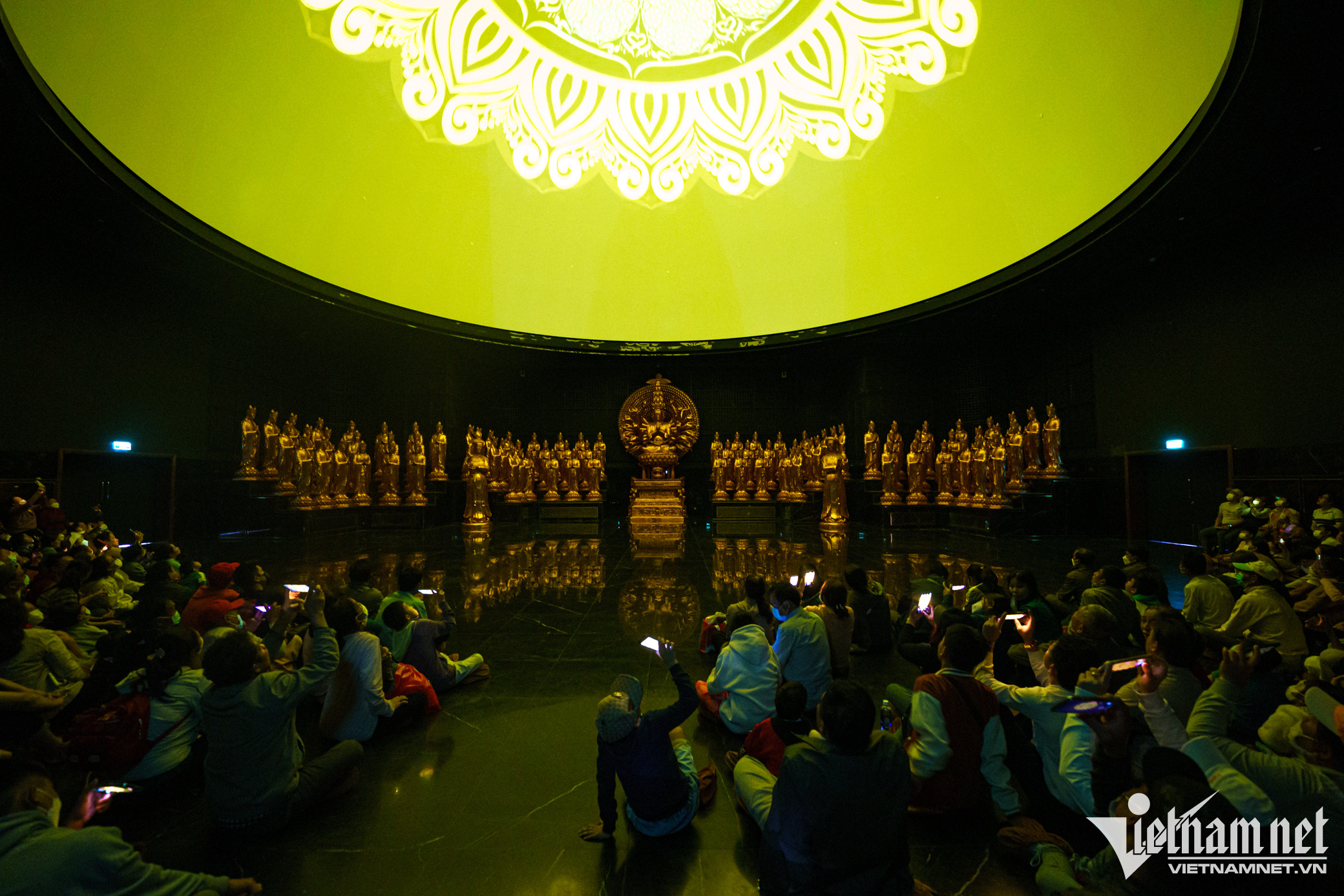 Tại khu vực đại sảnh mái vòm tầng 1, du khách được tìm hiểu và khám phá về vũ trụ trong quan niệm của Phật giáo thông qua công nghệ chiếu phim video mapping.
