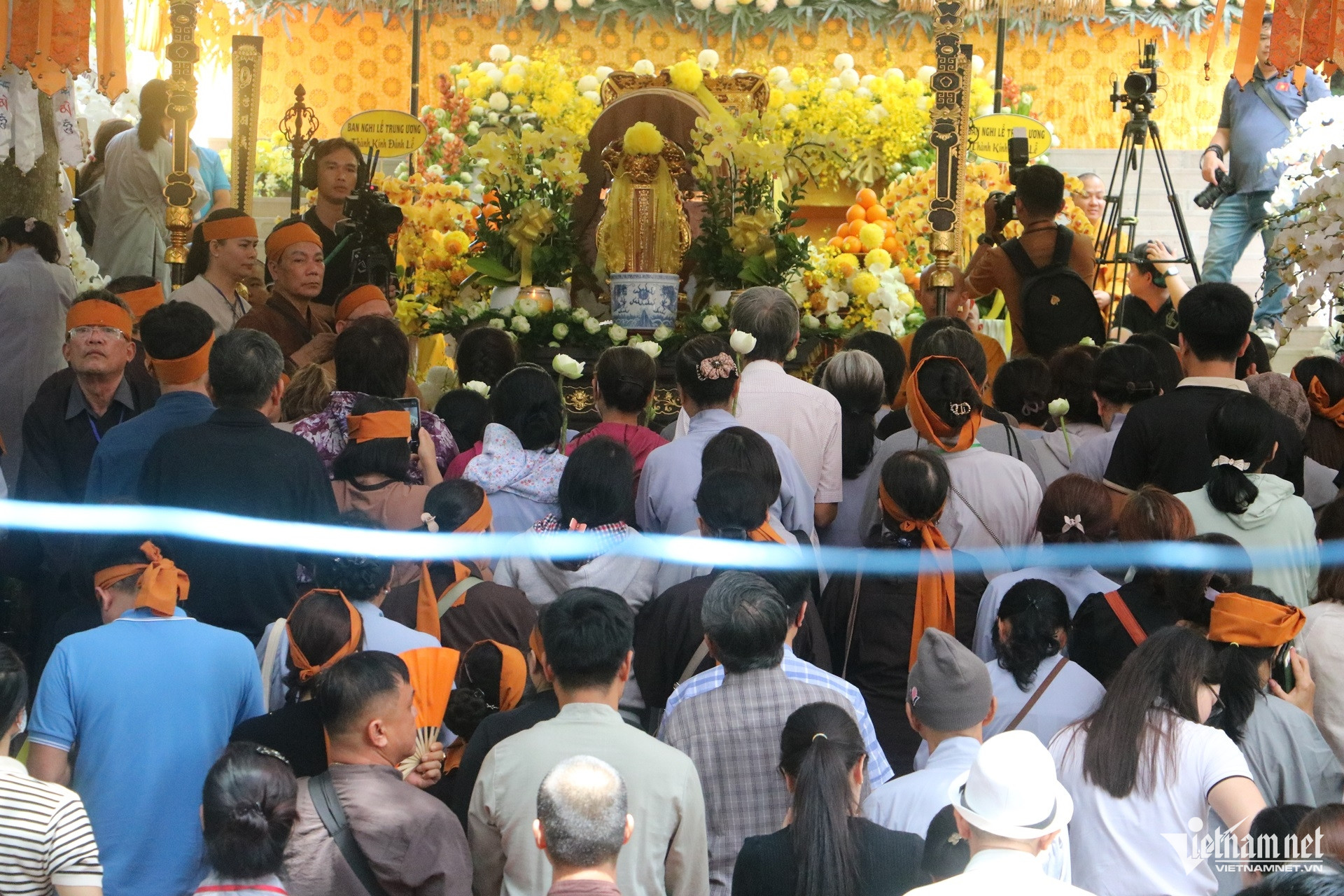 Hàng dài phật tử, người dân lần lượt xếp hàng, kính cẩn cúi đầu viếng, niệm Phật, bày tỏ lòng tôn kính trước khi kim quan được cung thỉnh vào nhập bảo tháp theo nghi thức Phật giáo.