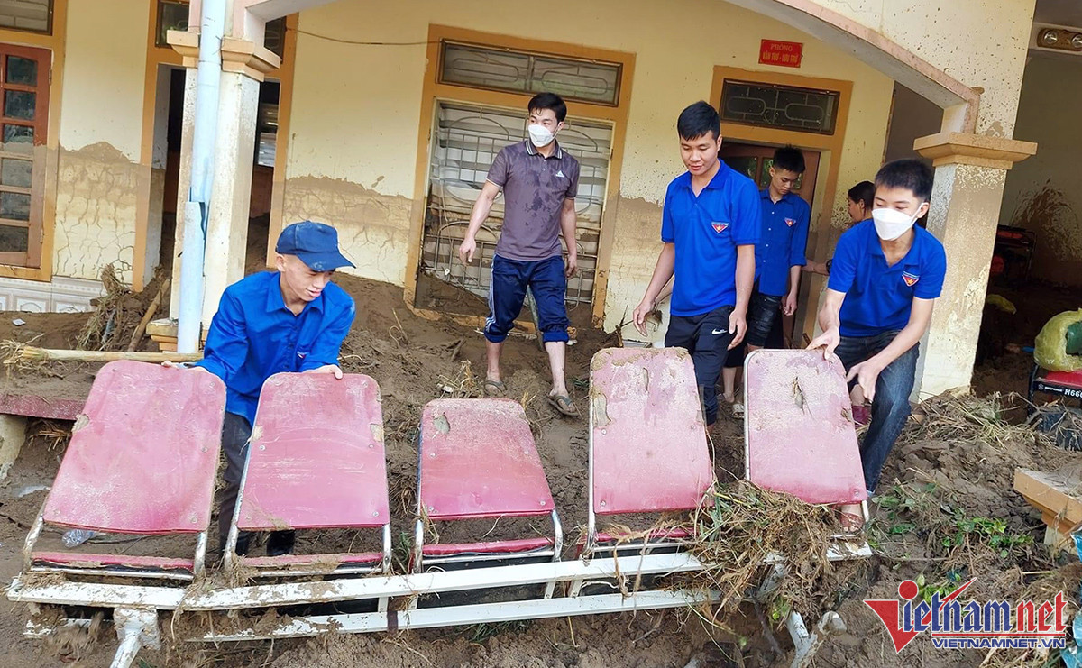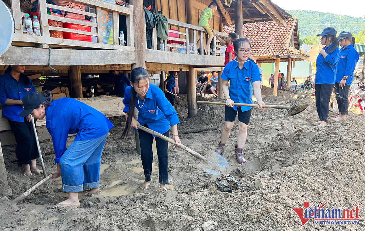 Rất đông giáo viên và nhiều lực lượng khác tham gia giúp dân khắc phục lũ ống, lũ quét - Ảnh: Quốc Huy