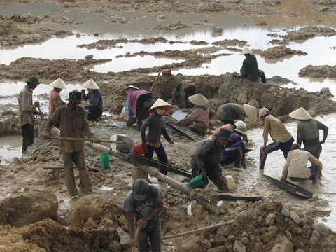 trăm người người chen lấn công nhân đào hố đãi vàng.