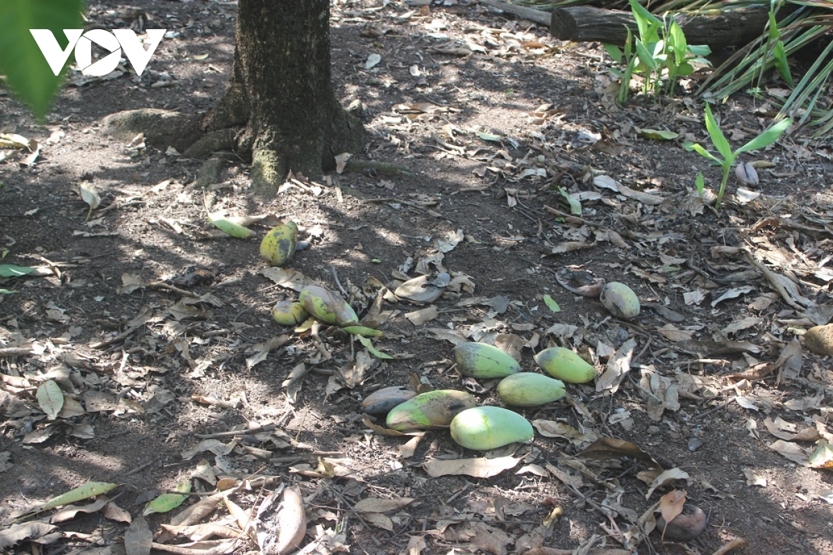Giá xoài Úc chỉ còn 2.000-3.000 đồng/kg, nhưng thương lái không thu mua, người trồng dừng thu hoạch, quả tự chín, rụng đầy gốc cả tháng nay.