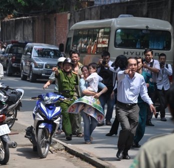 Lúc này, một cảnh sát mặc thường phục đã xốc nách 1 đứa bé tháo chạy ra ngoài.