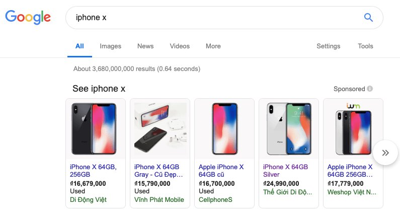 Một ví dụ về Google Shopping khi gõ từ khoá "iPhone X" - Ảnh chụp màn hình |