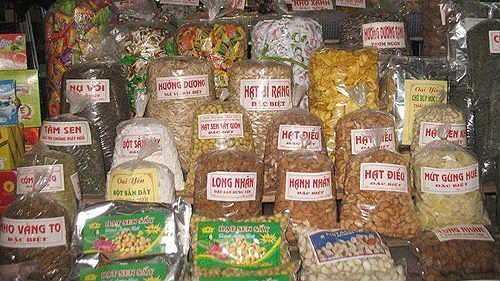 Cổng sau chợ Đồng Xuân là “thủ phủ” của các loại hạt. Tại đây, người tiêu dùng có thể “vô tư” chọn cho mình những loại hạt “nhấm nháp” phù hợp với sở thích của gia đình vào dịp Tết: sen sấy, hạt điều sấy, hạt bí, hạt dẻ cười, hạt hướng dương, hạt dẻ rừng,…