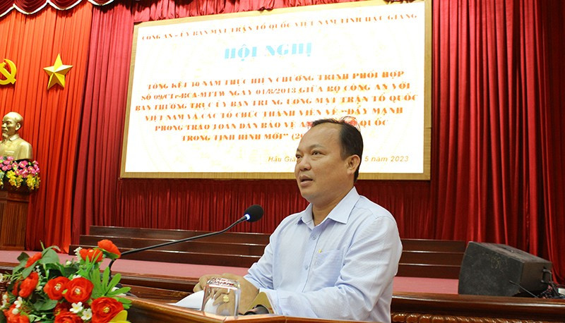 Tỉnh Hậu Giang vừa tổ chức Hội nghị tổng kết 10 năm thực hiện Chương trình phối hợp số 09/CTr-BCA-MTTQ ngày 01/8/2013 giữa Bộ Công an và Ban Thường trực Ủy ban Trung ương Mặt trận Tổ quốc Việt Nam và các tổ chức thành viên về “Đẩy mạnh phong trào toàn dân bảo vệ an ninh Tổ quốc trong tình hình mới”.