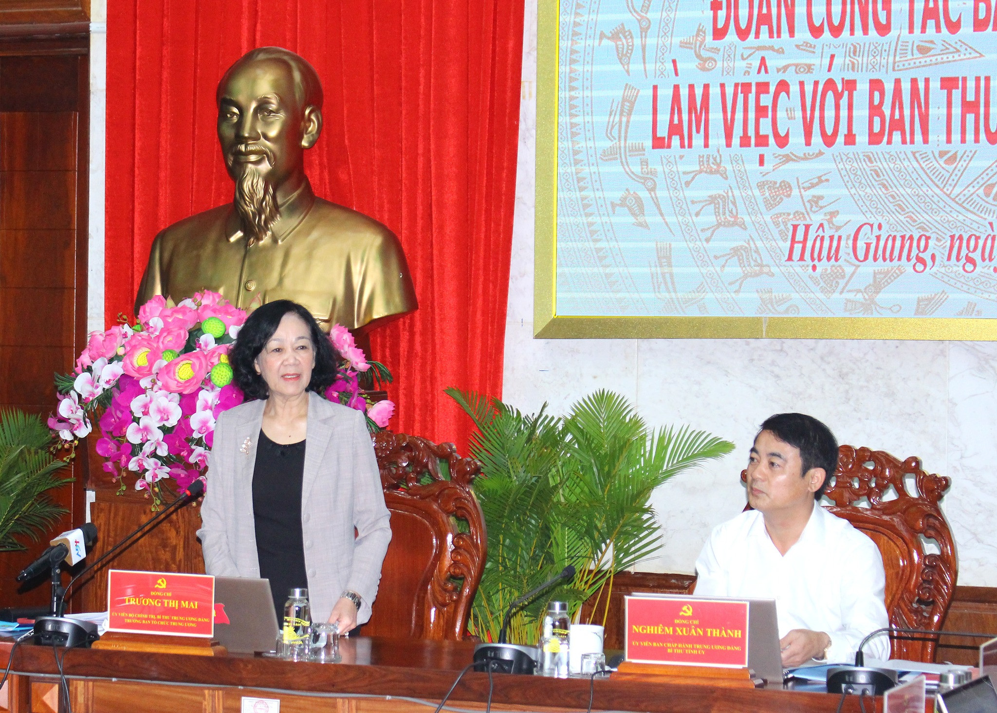 Bà Trương Thị Mai lưu ý: Hậu Giang cần tiếp tục quán triệt và thực hiện tốt các văn bản của Trung ương liên quan đến công tác cán bộ, trong đó cần cụ thể hóa 10 nhiệm vụ trọng tâm trong công tác tổ chức xây dựng Đảng, đó là chính trị, tư tưởng, đạo đức, tổ chức cơ sở Đảng và đảng viên, tổ chức bộ máy, cán bộ, kiểm tra giám sát, phòng, chống tham nhũng, tiêu cực, tăng cường mối quan hệ mật thiết với nhân dân, tiếp tục đổi mới phương thức lãnh đạo của Đảng trong tình hình mới.